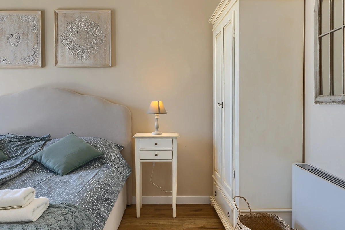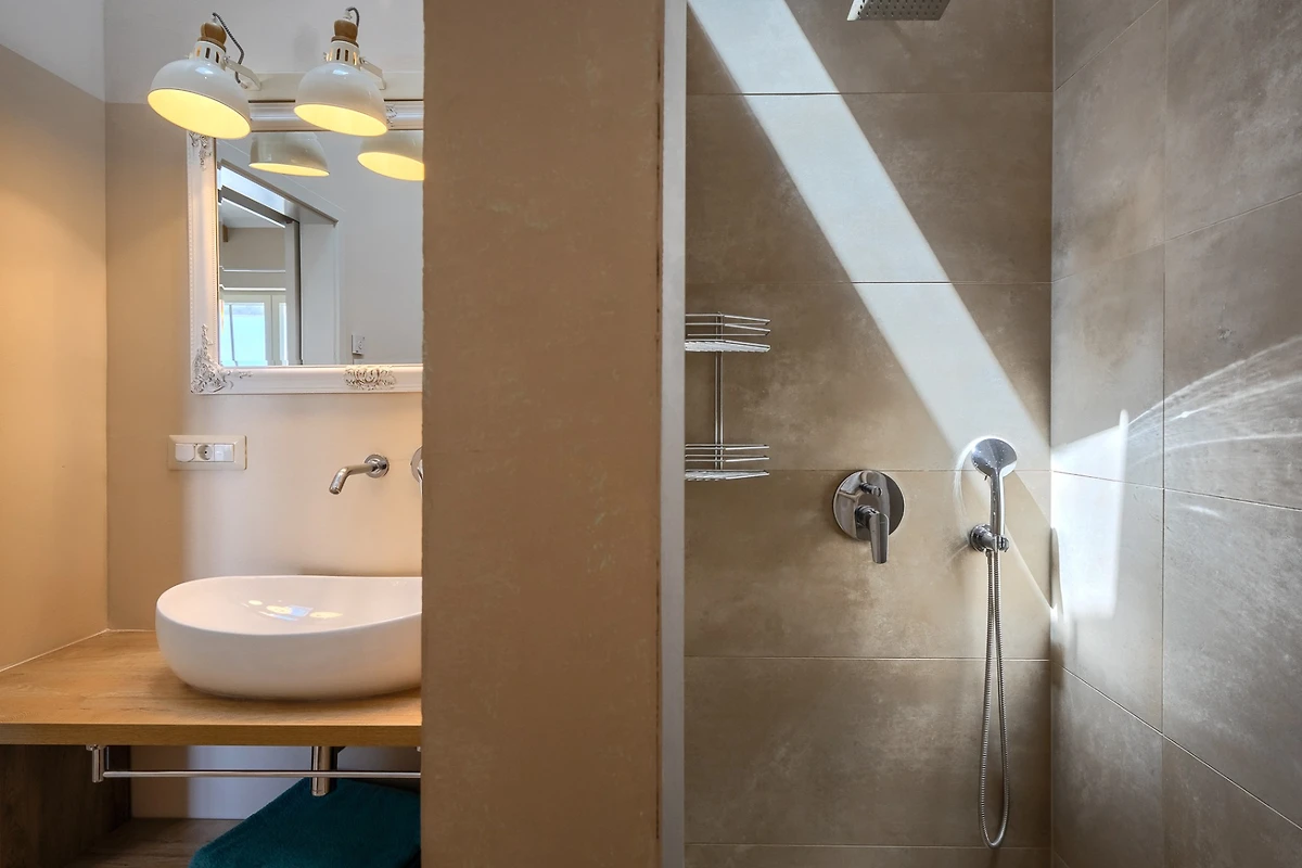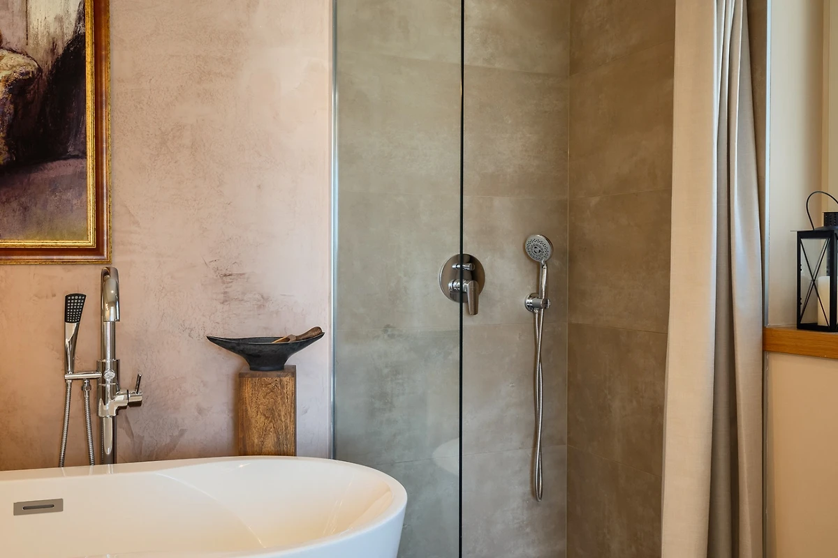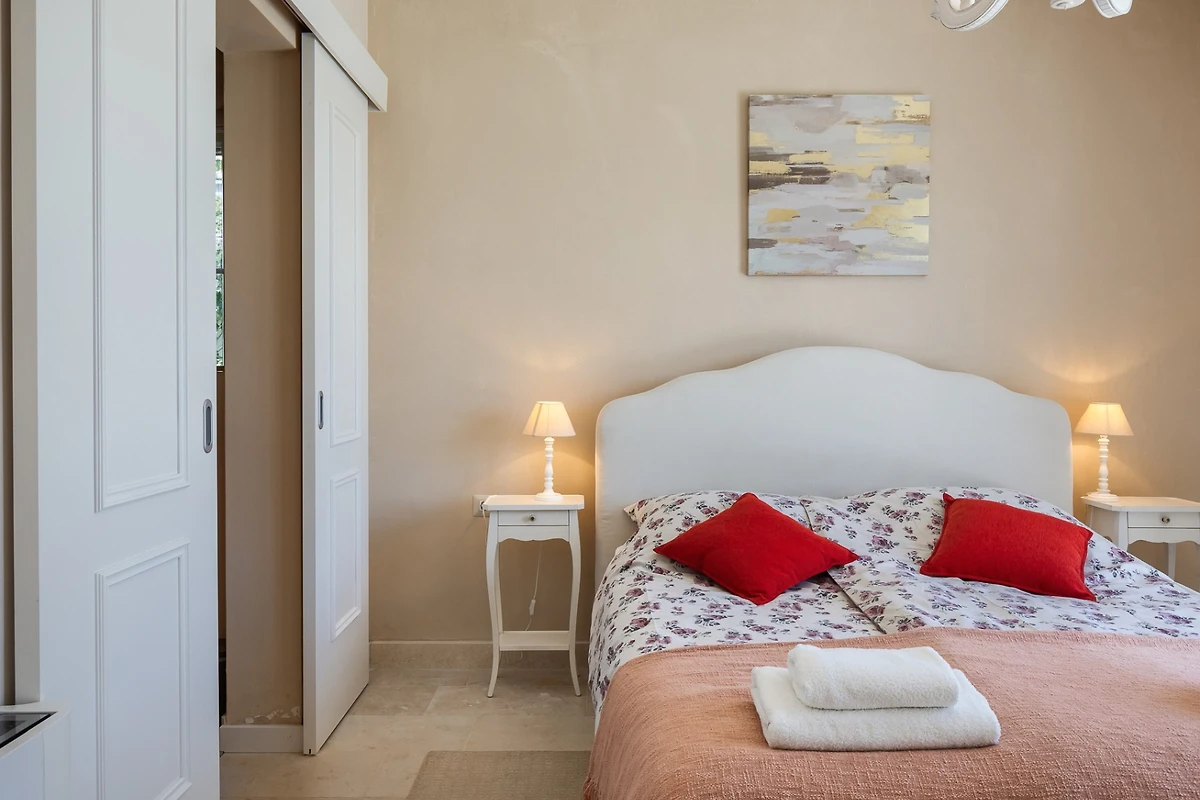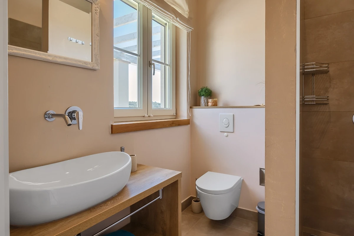 Le camere da letto sono distribuite sui piani, 1 al piano inferiore e le altre 5 al piano superiore. Ogni camera da letto ha il proprio bagno privato e tutte le stanze e i bagni sono dotati di riscaldamento a pavimento. Ancora una volta, il tema è quello dell'ariosità e dei toni neutri e piacevoli. Ogni camera da letto ha porte-finestre che conducono alla terrazza. In questo modo ogni ospite può godersi la vista dall'intimità della propria stanza. Le camere al piano superiore condividono una terrazza coperta comune, arredata con diversi tavoli e sedie. I bagni sono progettati in stile minimalista e moderno. Ognuno di essi dispone di una cabina doccia, mentre il bagno al piano terra è dotato sia di doccia che di vasca.