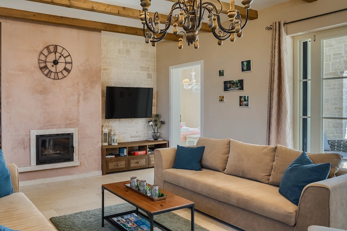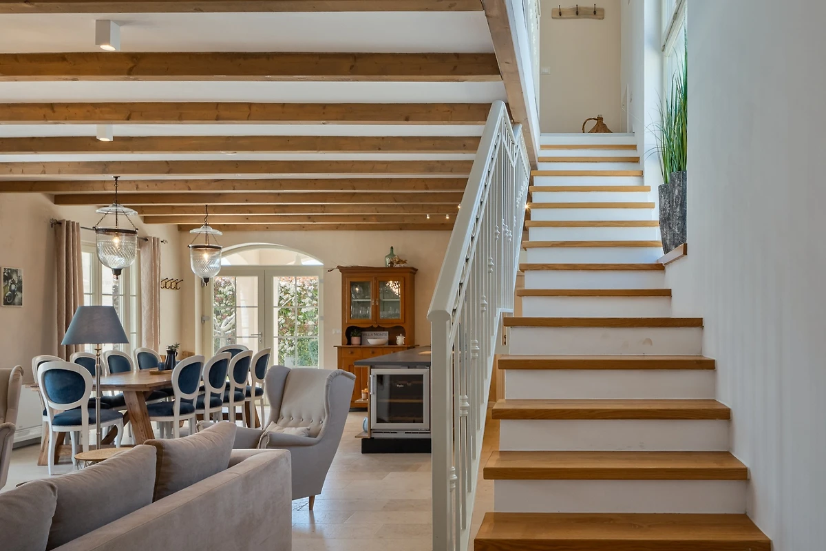 La proprietà di 220 m² si sviluppa su due piani. Al piano terra si trova una zona giorno open space con soggiorno, zona pranzo e cucina. Grazie a ben quattro ampie porte-finestre, lo spazio è estremamente arioso e luminoso. Anche stando comodamente seduti sul divano si ha una vista sulle colline circostanti. In tutta la stanza c'è una combinazione di colori beige che aumenta l'ariosità. Grazie al camino e al riscaldamento a pavimento, questo è il luogo ideale per rilassarsi e distendersi. Il divano è abbastanza grande per tutta la famiglia o per un gruppo di amici e, se volete, potete spostare la riunione su un tavolo da pranzo in legno con 10 posti a sedere. La cucina è completamente attrezzata con un ampio piano di lavoro per preparare pasti deliziosi.