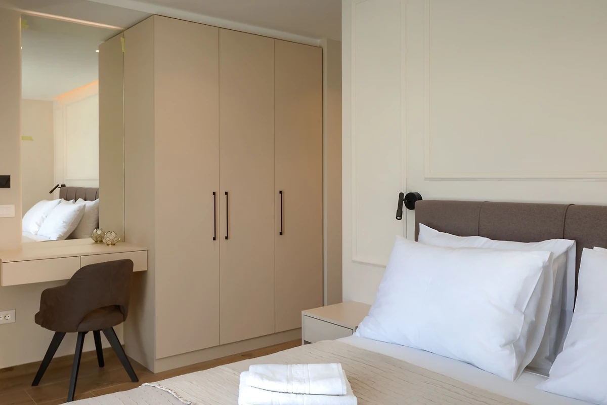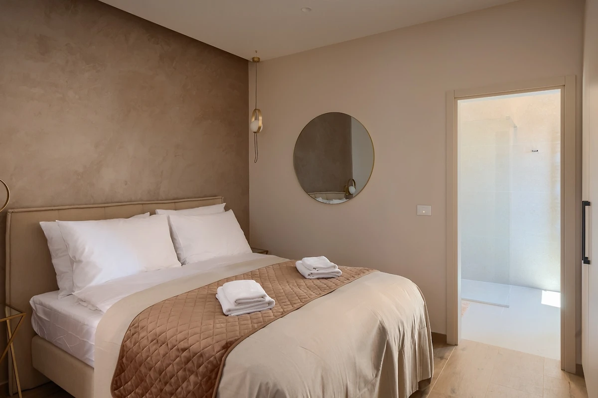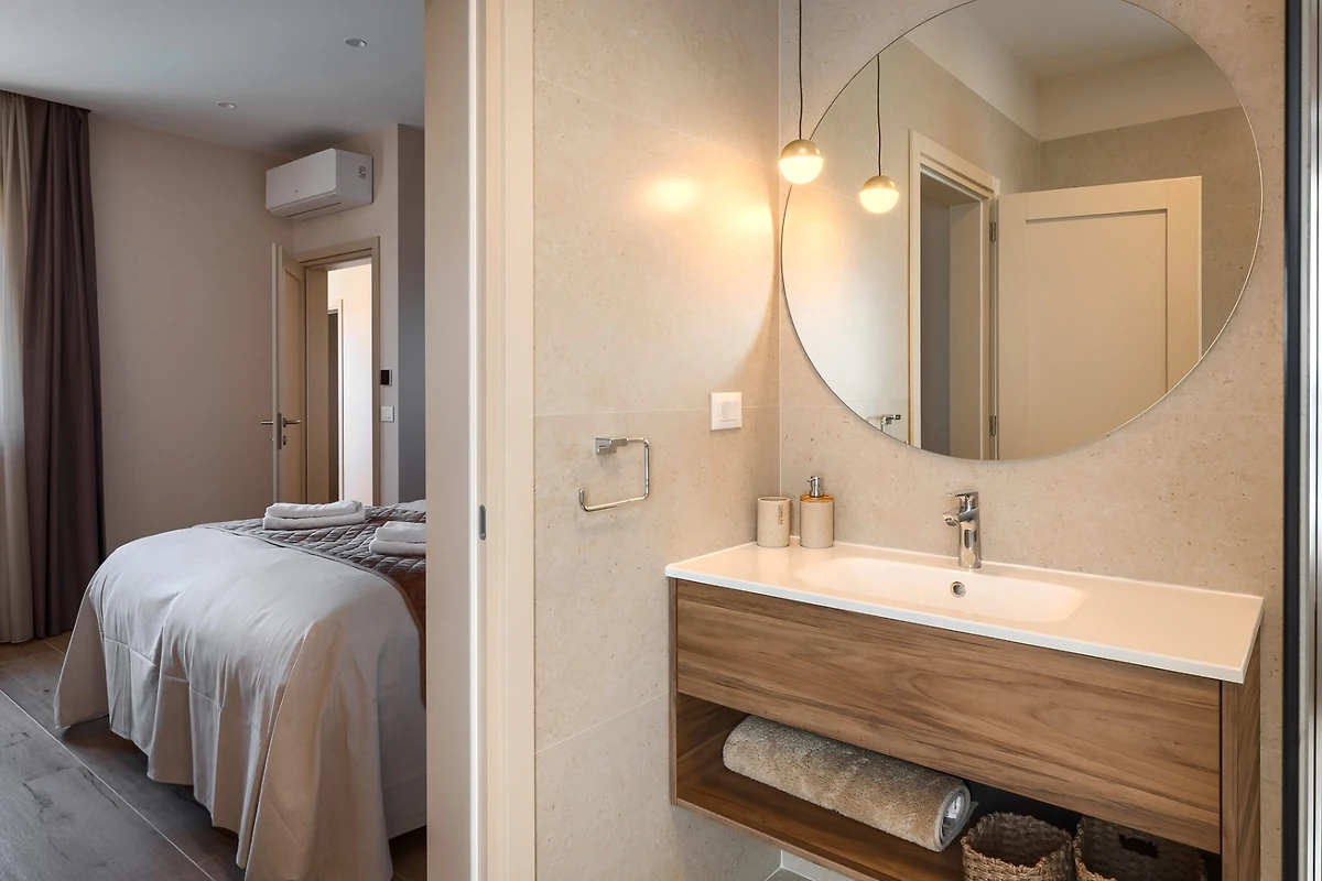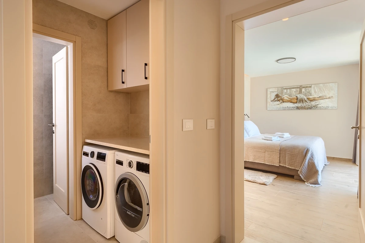Le camere da letto con aria condizionata sono disposte con 1 al piano terra e le altre 3 al primo piano. Ognuna delle 4 camere da letto ha un bagno privato. Anche in questo caso, i toni neutri della terra creano un'atmosfera rilassante e, per un comfort totale, tutte le camere e i bagni sono dotati di riscaldamento a pavimento. La camera da letto al piano inferiore ha accesso alla piscina e una delle camere da letto al piano superiore ha un proprio balcone con comode sedie e tavolo se si desidera godere di una vista idilliaca. I bagni emanano un senso di lusso moderno e includono articoli da toilette, asciugacapelli e accappatoi. Uno dei bagni al primo piano si distingue perché, oltre alla cabina doccia presente in tutti i bagni, dispone anche di vasca da bagno, bidet e due lavabi.