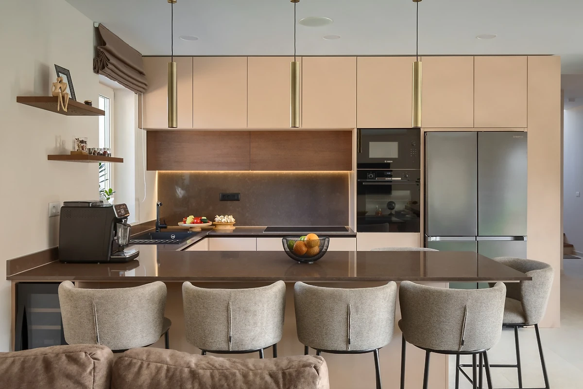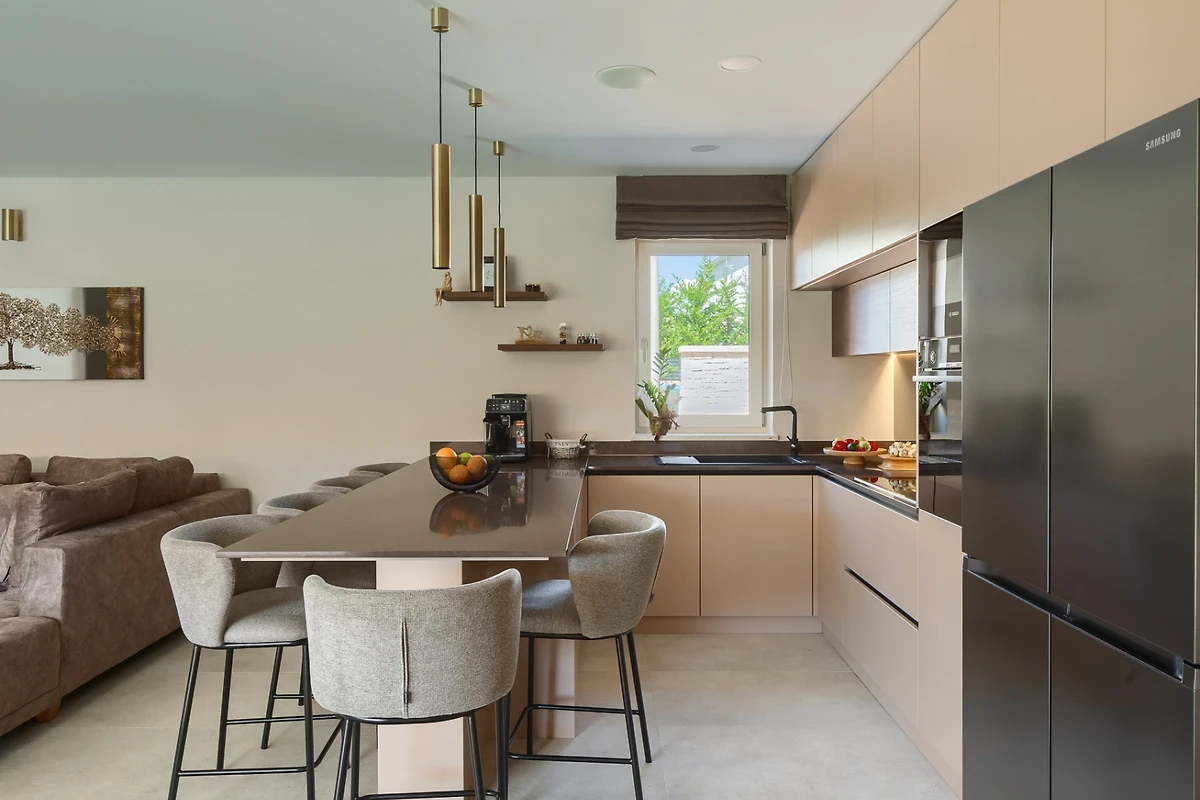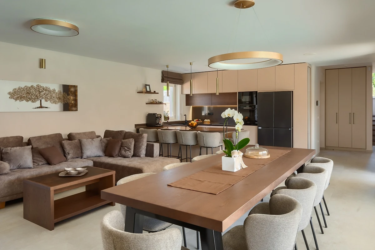 Al piano terra si trova una zona giorno open space che combina salotto, cucina e zona pranzo. Gli interni moderni, dominati da linee semplici e colori neutri, vi faranno sentire a casa. Lo spazio è pieno di luce naturale durante tutto il giorno grazie alla disposizione aperta e alle porte scorrevoli in vetro che occupano la maggior parte della parete esterna. Il soggiorno dispone anche di riscaldamento a pavimento. Rilassatevi con il vostro libro preferito sul divano a 8 posti con vista sul moderno caminetto o divertitevi a preparare specialità nella cucina completamente attrezzata con ampio piano d'appoggio. In seguito, gli ospiti possono riunirsi intorno al tavolo da pranzo da 10 persone per banchettare e chiacchierare.