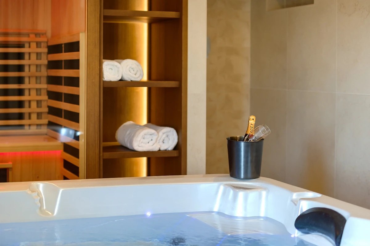 Anche il terreno di 744 m² della villa vi impressionerà. All'interno della proprietà recintata, c'è un parcheggio privato per 3 auto con un punto di ricarica per auto elettriche. La terrazza coperta è dotata di una moderna cucina estiva con barbecue. Accanto ad essa è possibile gustare le specialità preparate al grande tavolo da pranzo o sorseggiare un cocktail nel salone. Sull'altro lato del giardino, un tavolo rustico in legno e panche all'ombra di una tettoia offrono un'altra area per socializzare. Se invece preferite nuotare e prendere il sole, fate un tuffo nella piscina con doccia esterna e rilassatevi su uno degli 6 lettini. Per portare il vostro relax a un livello superiore, c'è un'area spa riscaldata a pavimento con sauna a infrarossi e vasca idromassaggio.