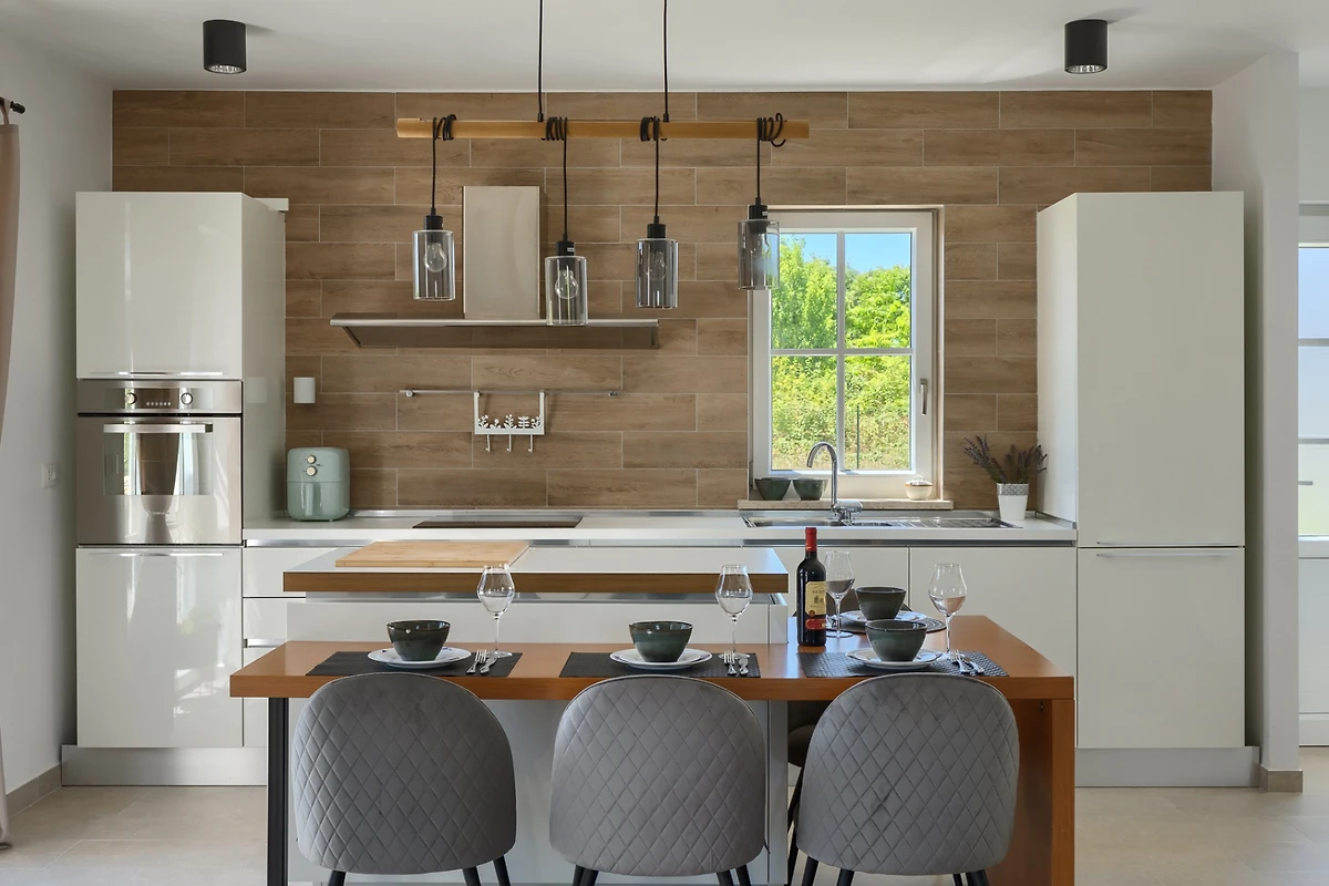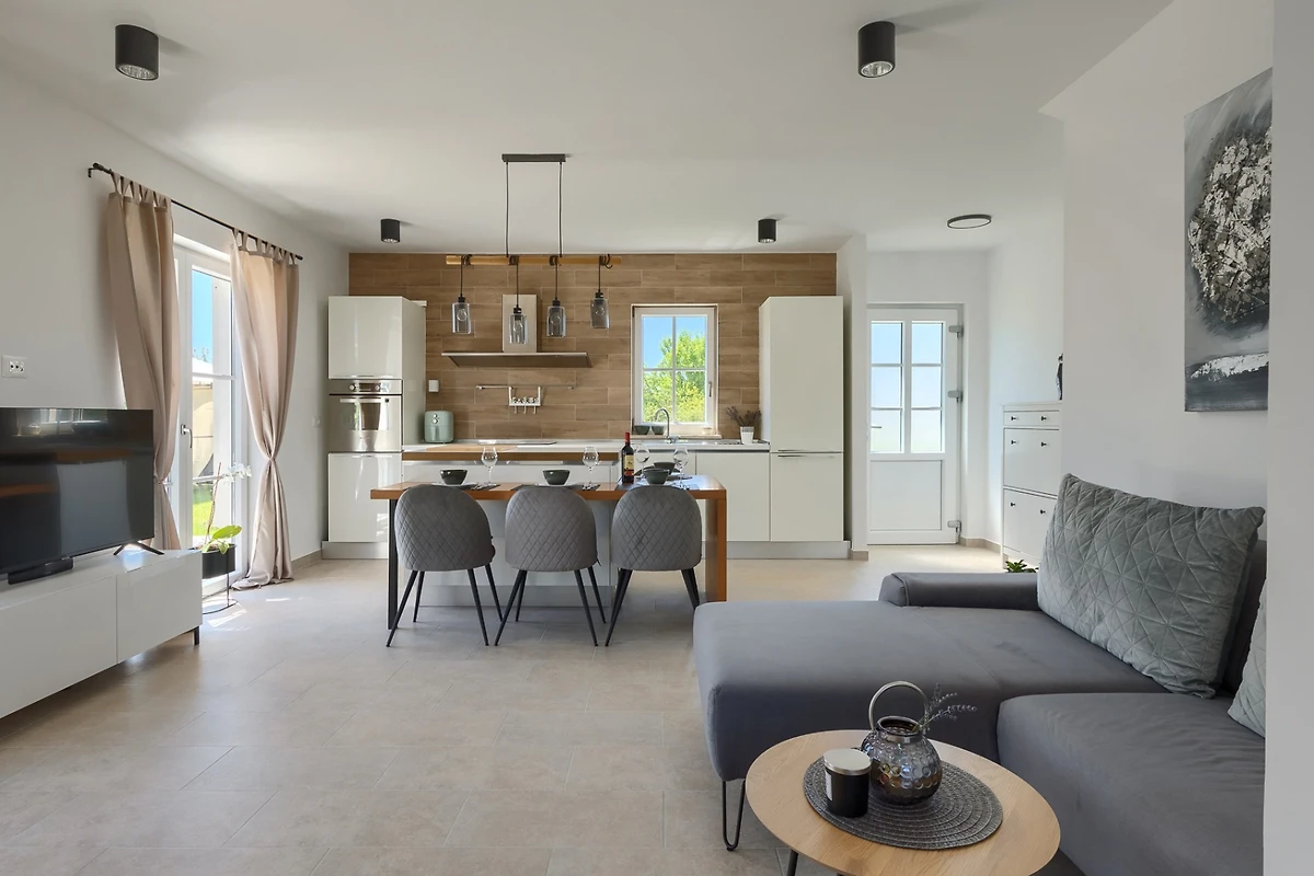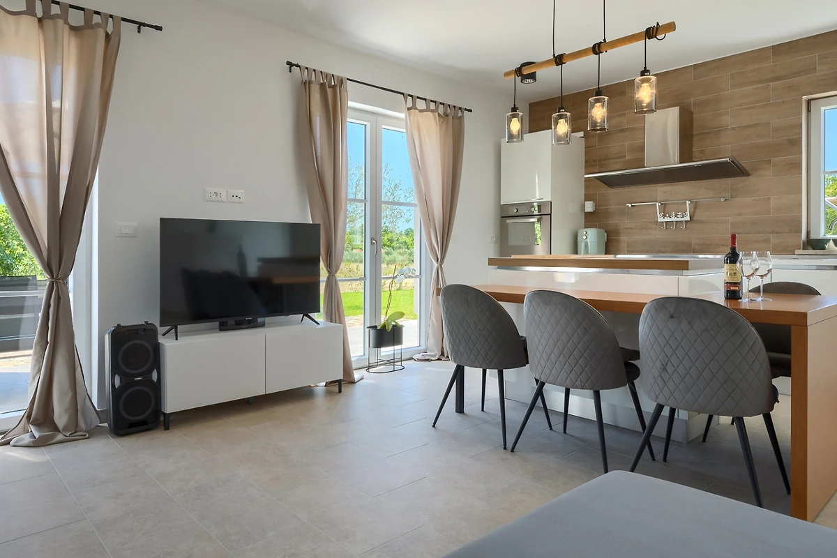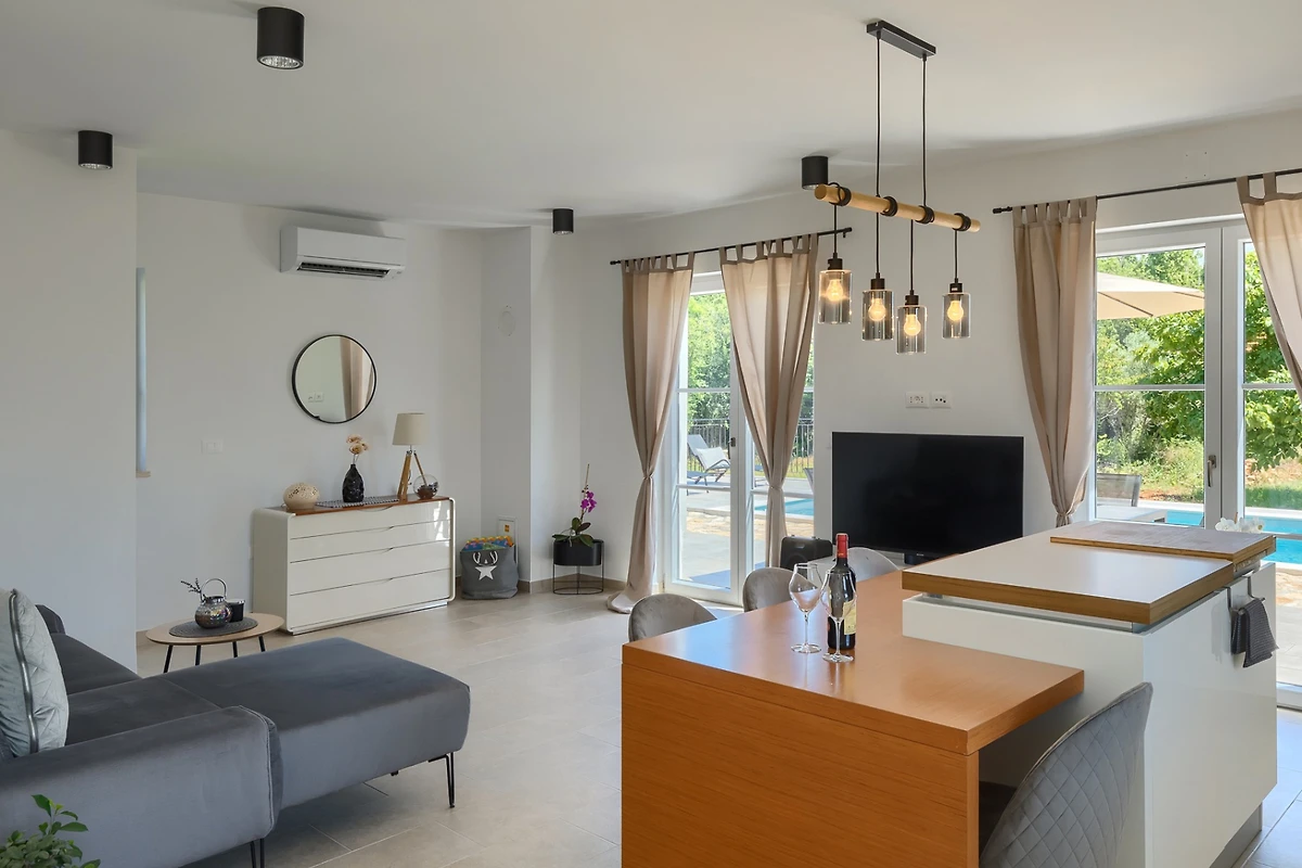 Entrando in casa, si viene accolti da uno spazio aperto e luminoso per pranzare e rilassarsi. C'è una moderna cucina lucida con tutti gli elettrodomestici necessari per preparare i pasti e una macchina per il caffè. Accanto alla cucina si trova un bar che si collega al tavolo da pranzo, rendendo quest'area ideale per servire il cibo. Accanto c'è un soggiorno con divano e Smart TV. C'è anche un angolo per i più piccoli, che potrete sempre tenere d'occhio grazie all'apertura dello spazio. Due porte francesi conducono alla terrazza esterna, conferendo all'ambiente un tocco di carattere e molta luce naturale. Tutte le stanze sono dotate di aria condizionata.