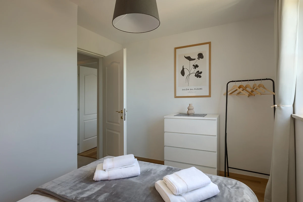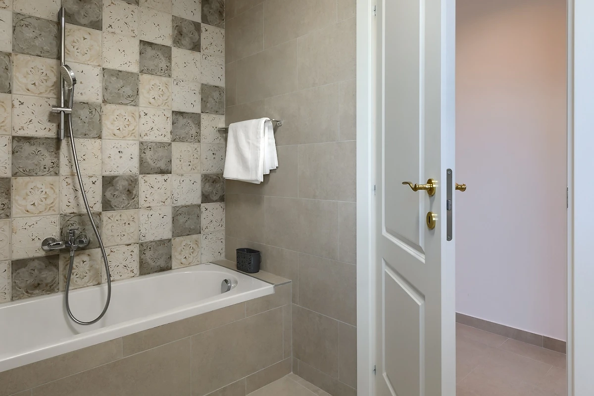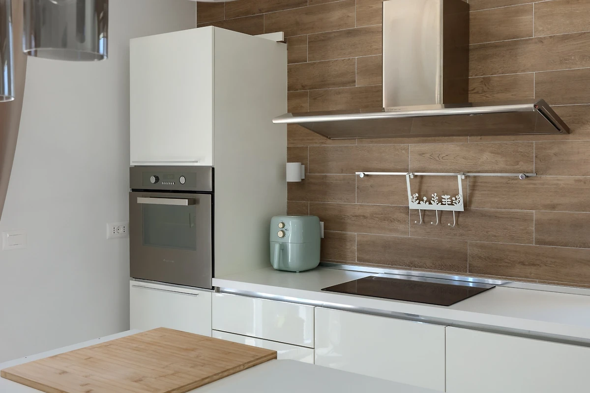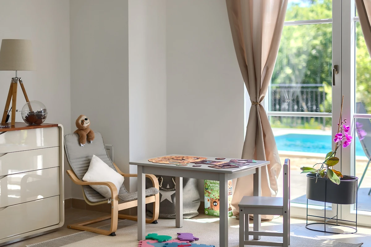 Entrando in casa, si viene accolti da uno spazio aperto e luminoso per pranzare e rilassarsi. C'è una moderna cucina lucida con tutti gli elettrodomestici necessari per preparare i pasti e una macchina per il caffè. Accanto alla cucina si trova un bar che si collega al tavolo da pranzo, rendendo quest'area ideale per servire il cibo. Accanto c'è un soggiorno con divano e Smart TV. C'è anche un angolo per i più piccoli, che potrete sempre tenere d'occhio grazie all'apertura dello spazio. Due porte francesi conducono alla terrazza esterna, conferendo all'ambiente un tocco di carattere e molta luce naturale. Tutte le stanze sono dotate di aria condizionata.