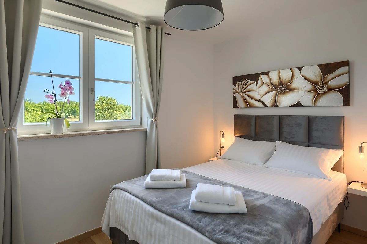 Dopo una giornata trascorsa a rilassarsi all'ombra di un ulivo, è possibile fare una gita per esplorare i dintorni. Vicino all'alloggio si trova la cittadina di Buie, nota per il suo stile di vita autentico, semplice e rilassato. Anche voi potrete assaporare una dose di questo relax passeggiando per le strade di questa pittoresca cittadina ed esplorando il ricco patrimonio culturale della regione. Se avete voglia di mare, non preoccupatevi: le città costiere di Umago e Cittanova sono a soli 20 minuti di auto. Qui potrete nuotare, mangiare e bere e concludere la giornata con la vista di uno spettacolare tramonto.