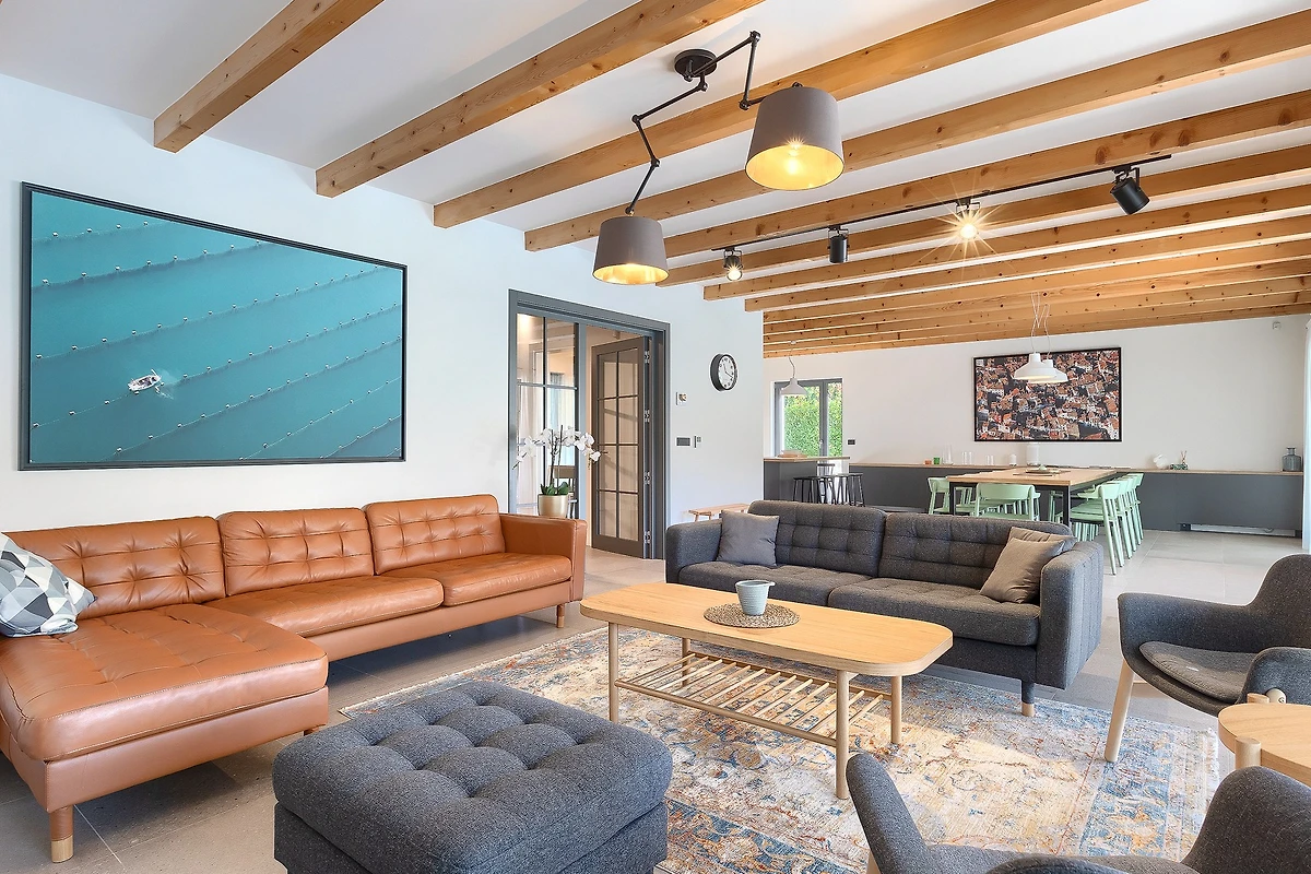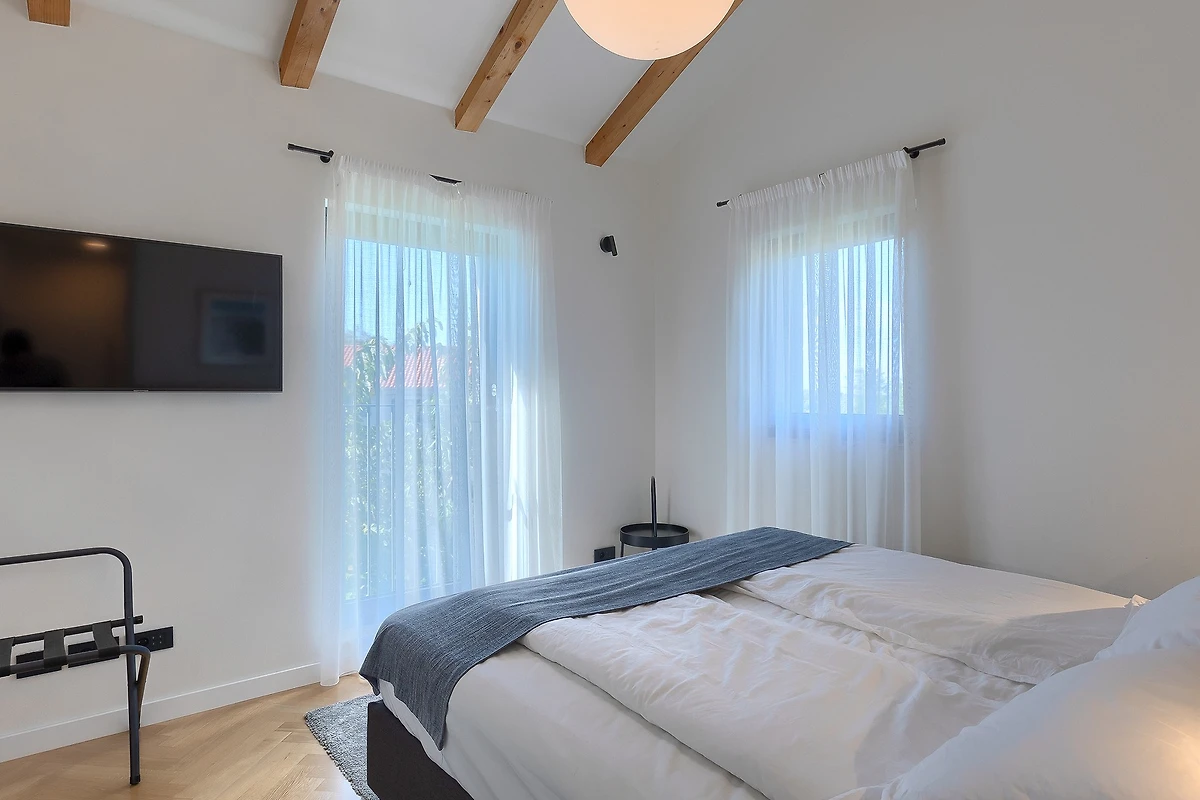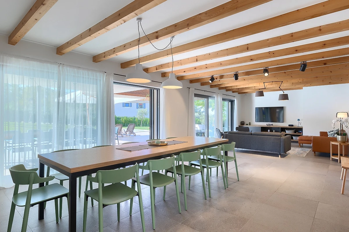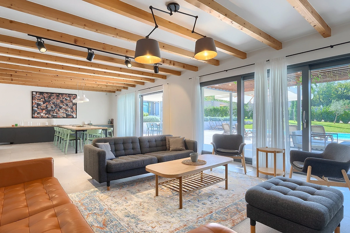 L'interno di questa villa si estende su 209 m² e si sviluppa su 2 piani. Al piano terra si trova uno spazio aperto, caldo e modernamente arredato, con travi in legno che conferiscono un'atmosfera rustica. La cucina è completamente attrezzata e pronta a preparare deliziosi pasti da gustare al tavolo da pranzo. Dopo cena, potrete rilassarvi nel soggiorno dove vi attendono comodi divani e poltrone. Le grandi porte del balcone collegano visivamente l'interno con l'esterno e attraverso di esse si ha una vista costante sulla terrazza esterna. Tutte le stanze sono dotate di aria condizionata e il riscaldamento centrale è disponibile per le giornate più fredde.