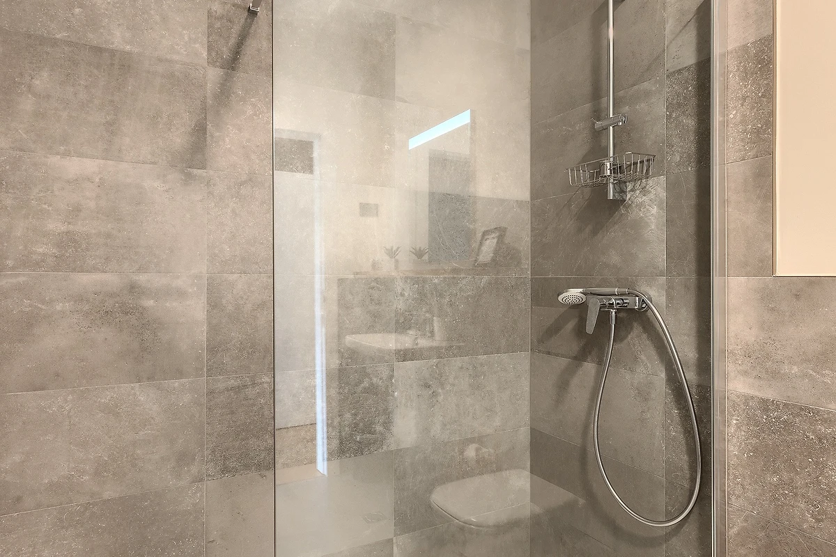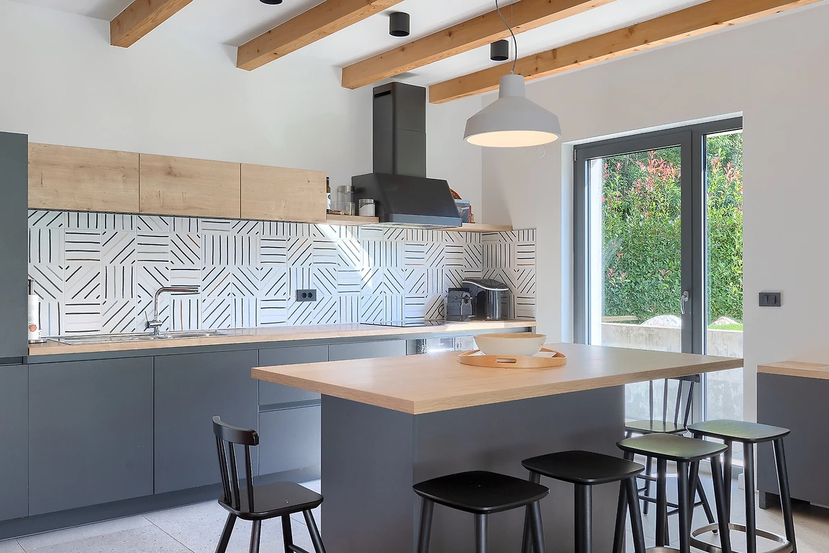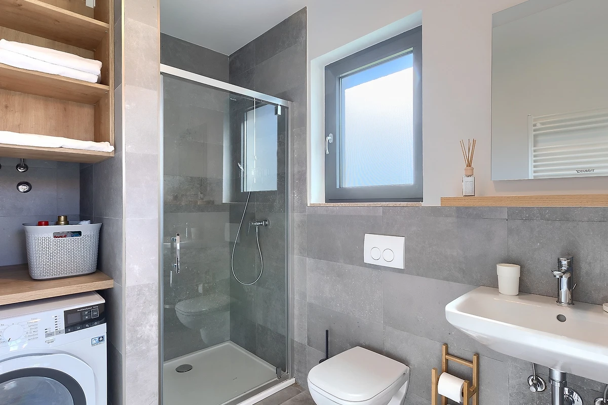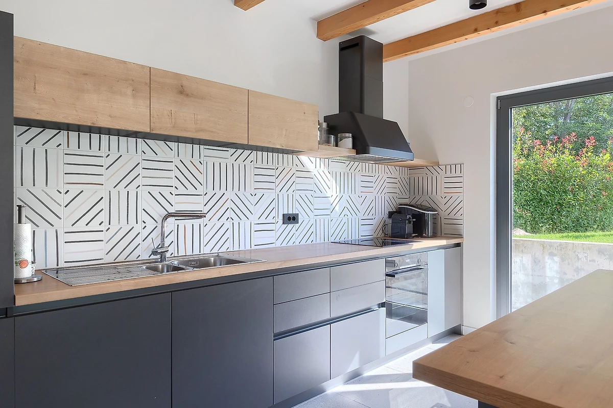 L'interno di questa villa si estende su 209 m² e si sviluppa su 2 piani. Al piano terra si trova uno spazio aperto, caldo e modernamente arredato, con travi in legno che conferiscono un'atmosfera rustica. La cucina è completamente attrezzata e pronta a preparare deliziosi pasti da gustare al tavolo da pranzo. Dopo cena, potrete rilassarvi nel soggiorno dove vi attendono comodi divani e poltrone. Le grandi porte del balcone collegano visivamente l'interno con l'esterno e attraverso di esse si ha una vista costante sulla terrazza esterna. Tutte le stanze sono dotate di aria condizionata e il riscaldamento centrale è disponibile per le giornate più fredde.
