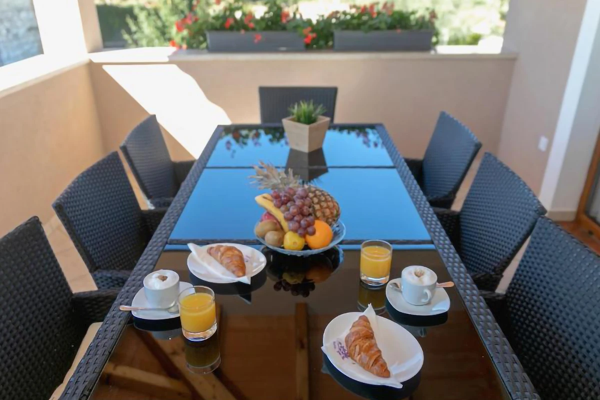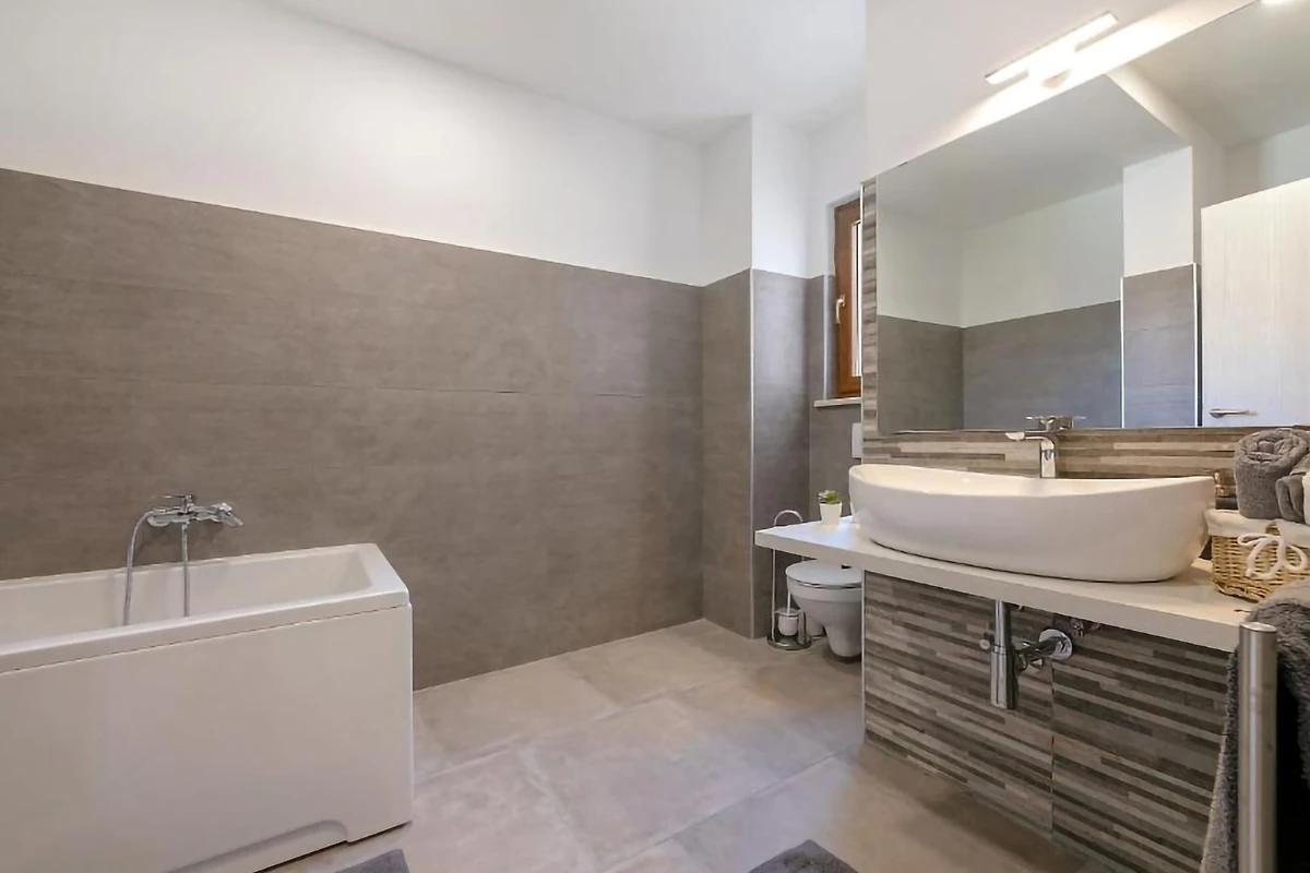Arrivando al 1° piano, sarete accolti dal secondo appartamento. Qui troverete una cucina con bar e una sala da pranzo, oltre all'accesso a un'ampia terrazza con un tavolo da pranzo all'aperto. Dalla sala da pranzo si accede allo spazioso soggiorno, ideale per rilassarsi nel pomeriggio. Su questo piano si trovano 2 camere da letto con bagno in comune. Una camera ha un letto matrimoniale e l'altra ha 2 letti singoli. Ogni camera ha una splendida vista sul verde circostante e sul magico paesaggio istriano. Al 2° piano della casa si trovano altre 2 camere da letto e un bagno. In sintesi, la villa dispone di un totale di 6 camere da letto e 5 bagni.