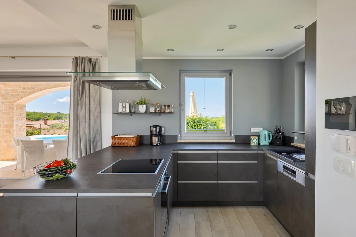 La cucina americana, a induzione, è attrezzata con frigorifero, forno, congelatore, lavastoviglie, utensili da cucina, caffettiera e tostapane.
