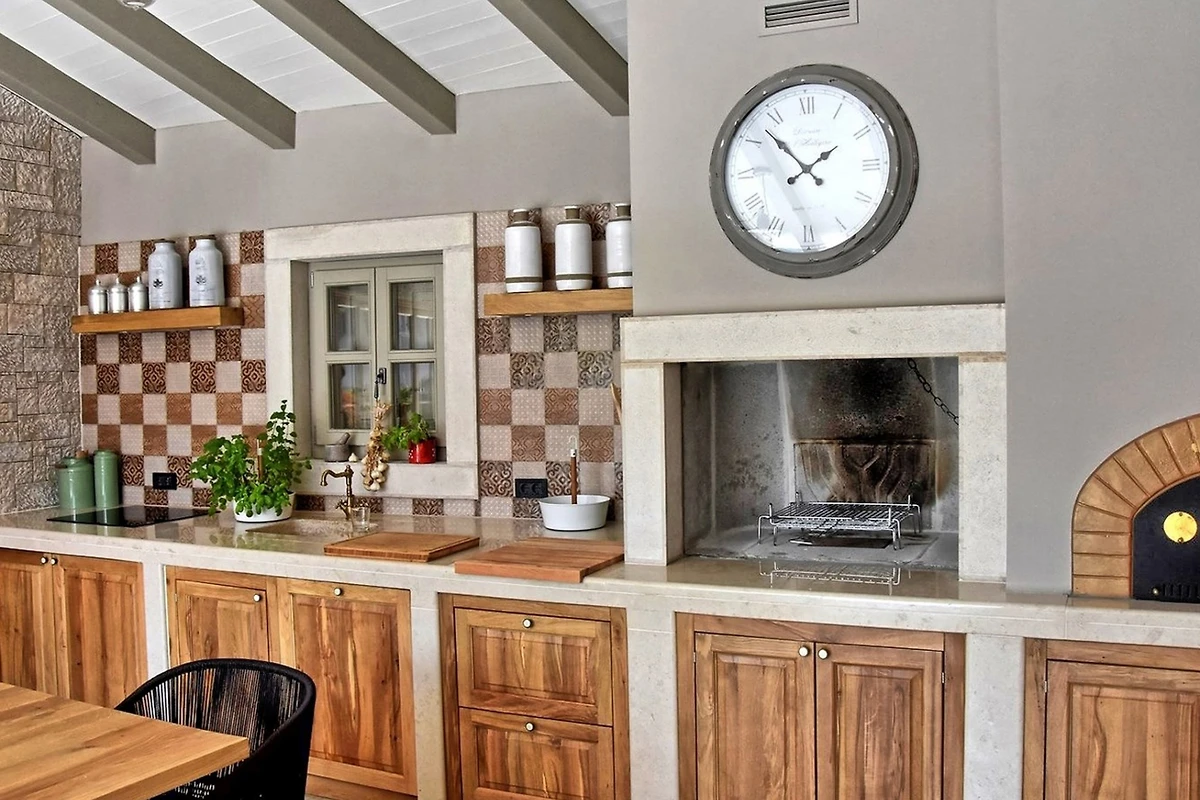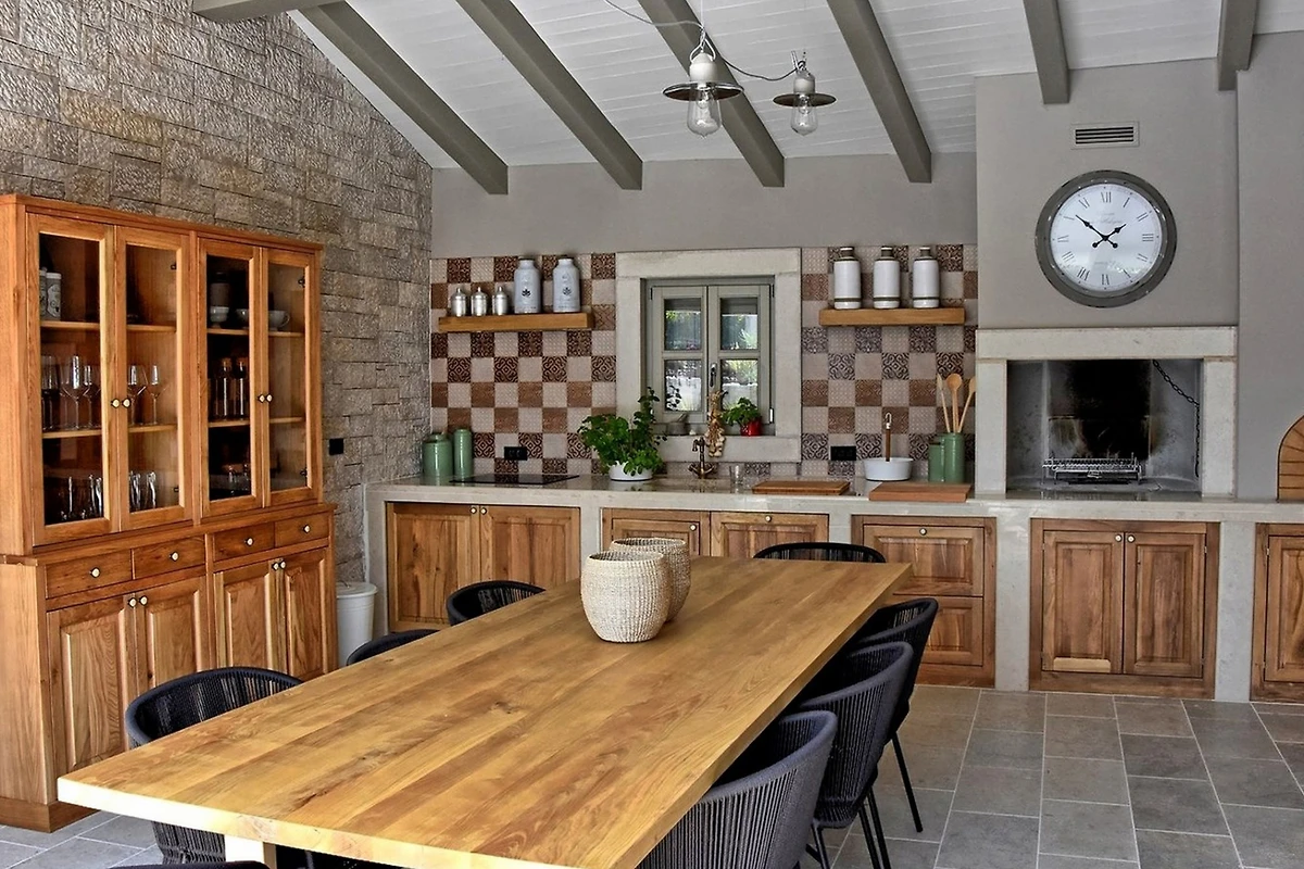 Villa Zita è composta da 2 edifici separati che condividono un cortile. La superficie interna totale della villa è di 320 m² e si sviluppa su 2 piani. La villa vi accoglie con un soggiorno con camino e TV, ideale per il relax diurno o serale con film. C'è anche una spaziosa cucina con tutto il necessario per preparare pasti deliziosi e, se preferite cucinare all'aperto, c'è una cucina estiva con accesso alla terrazza con piscina. La cucina dispone anche di un tavolo da pranzo con 8 sedie.