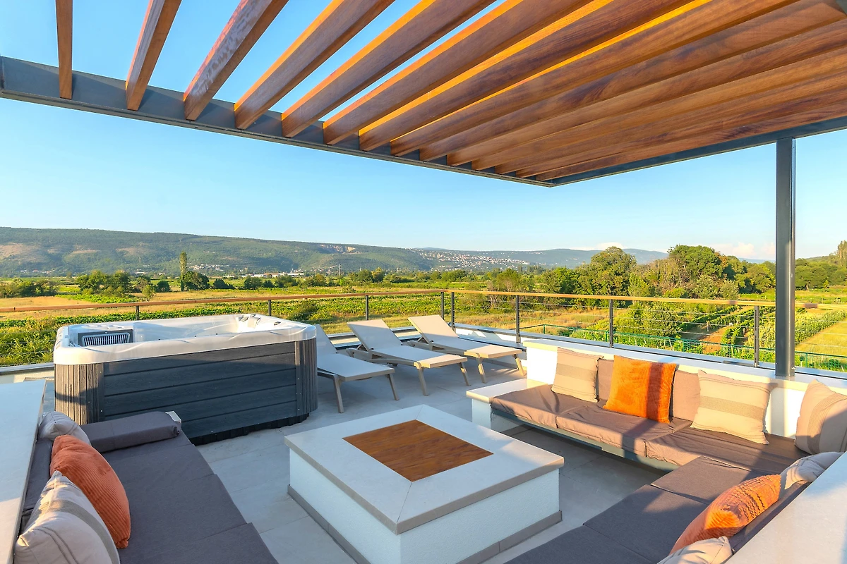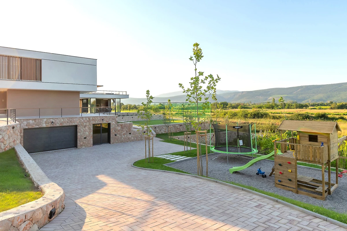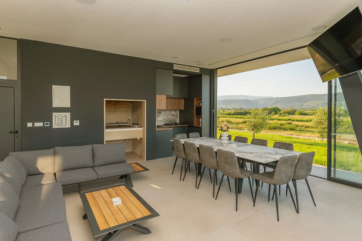 Ogni dettaglio della villa è stato studiato con cura per offrire un'esperienza straordinaria. Immersa in un ambiente tranquillo e naturale, circondata da vigneti, regala una vista spettacolare sui campi circostanti e sulla città di Imotski, raggiungibile in soli 10 minuti di auto. Il mare cristallino e le spiagge di ciottoli di Baška Voda e Brela distano appena 20 km.