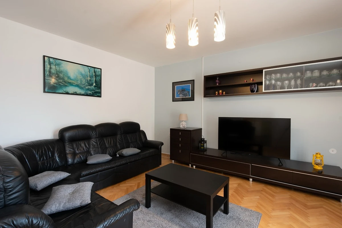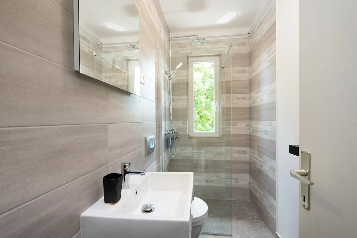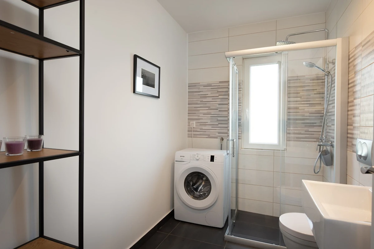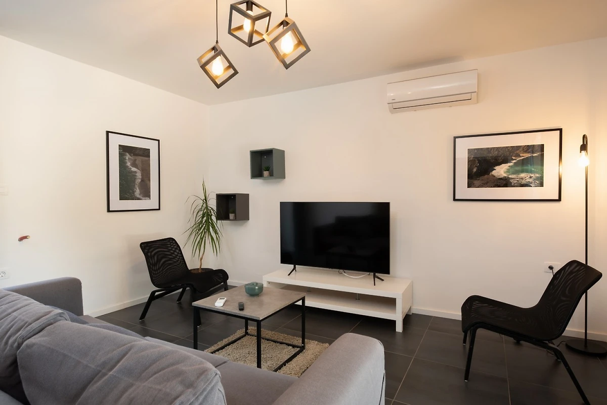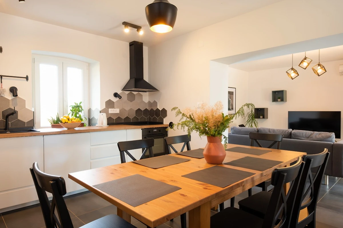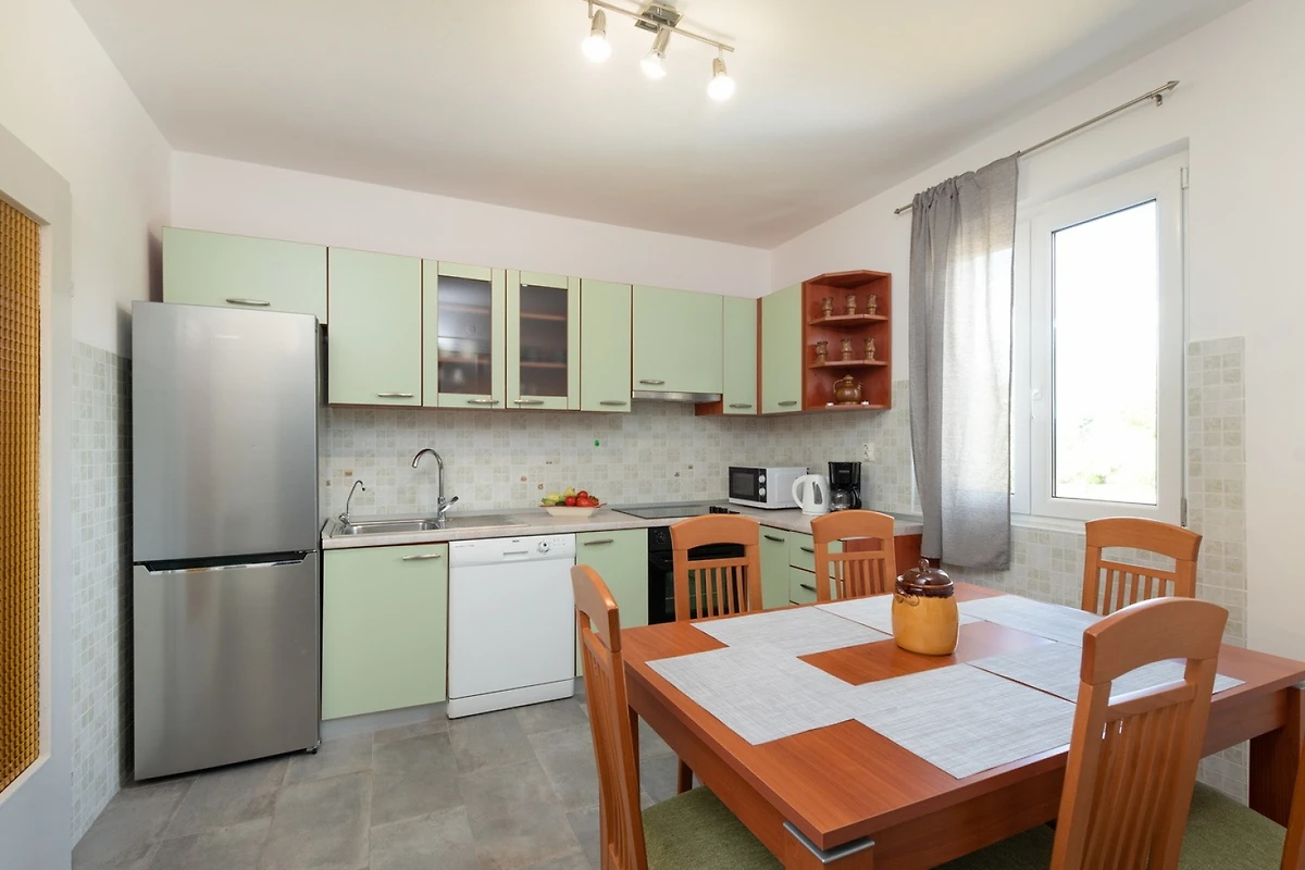 L'interno della villa è di 220 m², e la villa stessa è progettata in modo che il piano terra e il 1° piano formino 2 unità separate collegate dalle scale esterne. Questo la rende la scelta ideale per 2 famiglie o un gruppo di amici che vogliono godersi una vacanza insieme mantenendo privacy e intimità. L'interno della villa è arredato con particolare attenzione al comfort e alla funzionalità. Avrete a disposizione 2 cucine completamente attrezzate, ognuna con lavastoviglie, lavatrice, frigorifero, piano cottura con forno e tutti gli utensili necessari per preparare i pasti. Al piano terra c'è un soggiorno con accesso alla terrazza, dotato di un divano che può essere convertito in un letto supplementare. Al primo piano c'è un secondo soggiorno, anch'esso con accesso alla terrazza, e qui il divano è fisso.