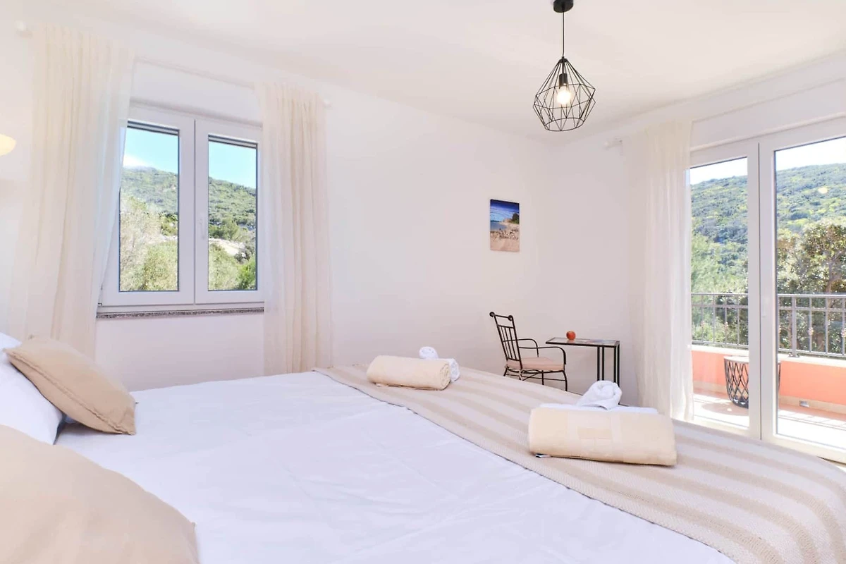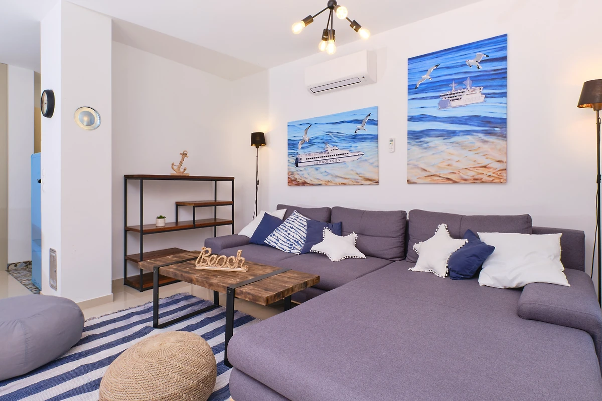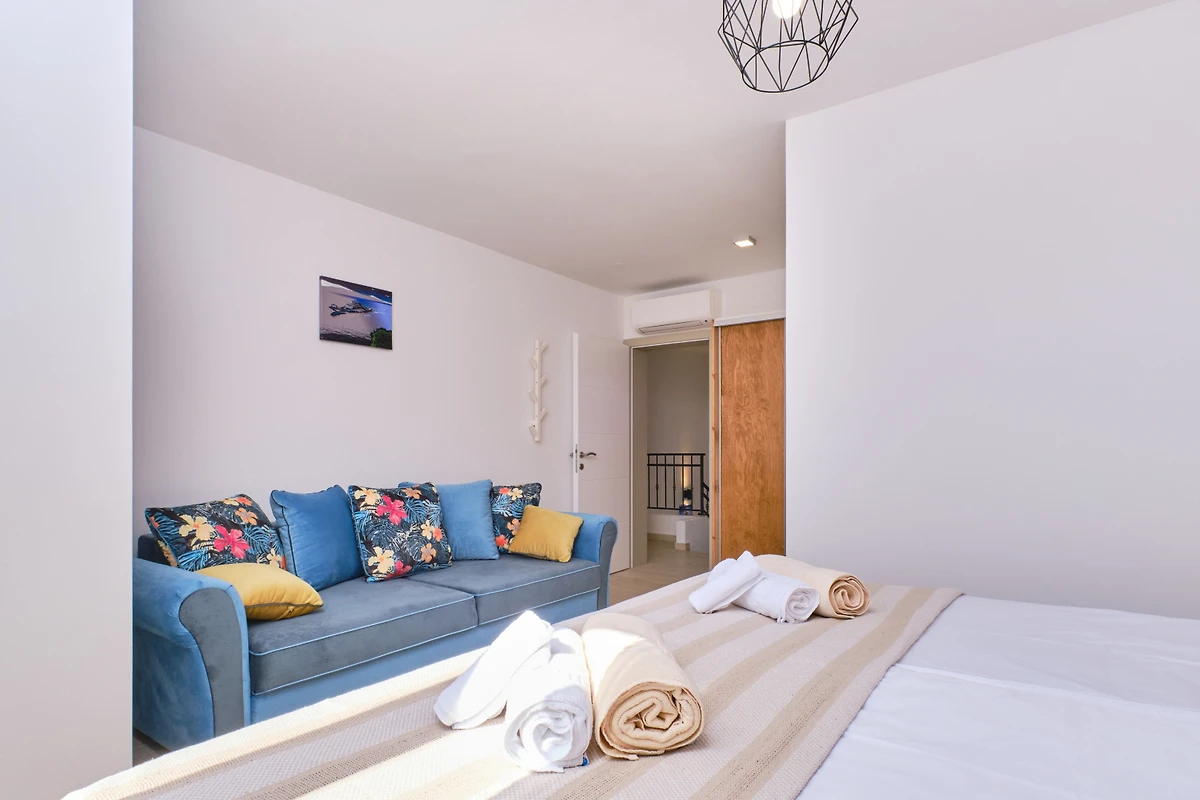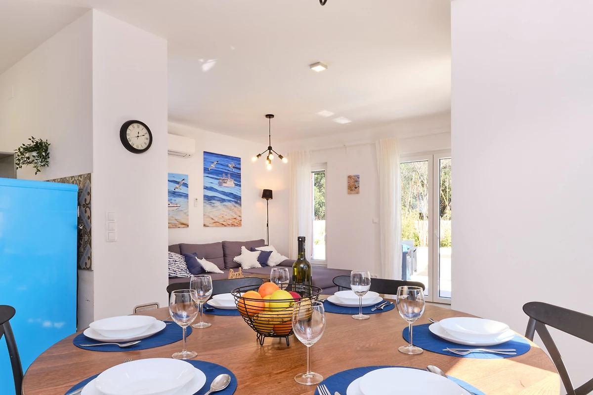 La villa accoglie comodamente fino a 6 ospiti con 2 camere da letto che presentano 2 letti king-size e un divano letto matrimoniale. Tre bagni ben attrezzati con docce garantiscono comodità e privacy per tutti gli ospiti. La cucina moderna in stile americano è completamente attrezzata con cottura a induzione, frigorifero, congelatore, lavastoviglie, forno, macchina da caffè, tostapane e stoviglie complete.