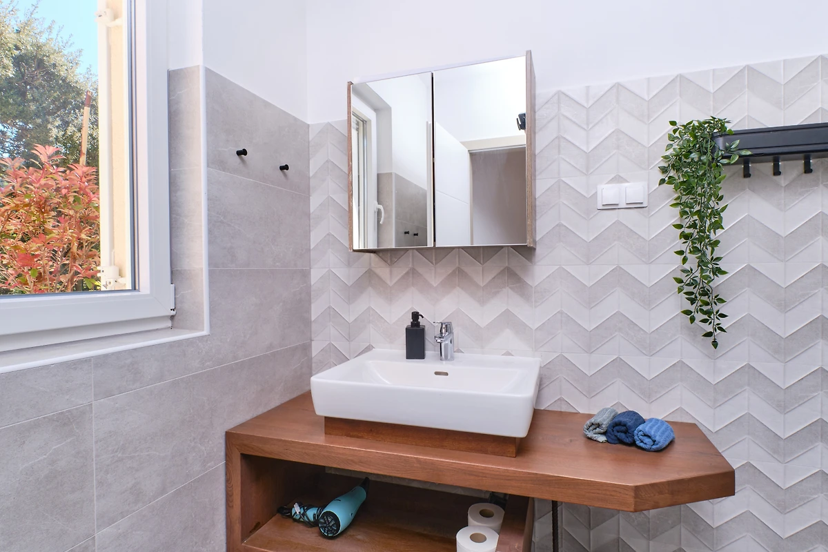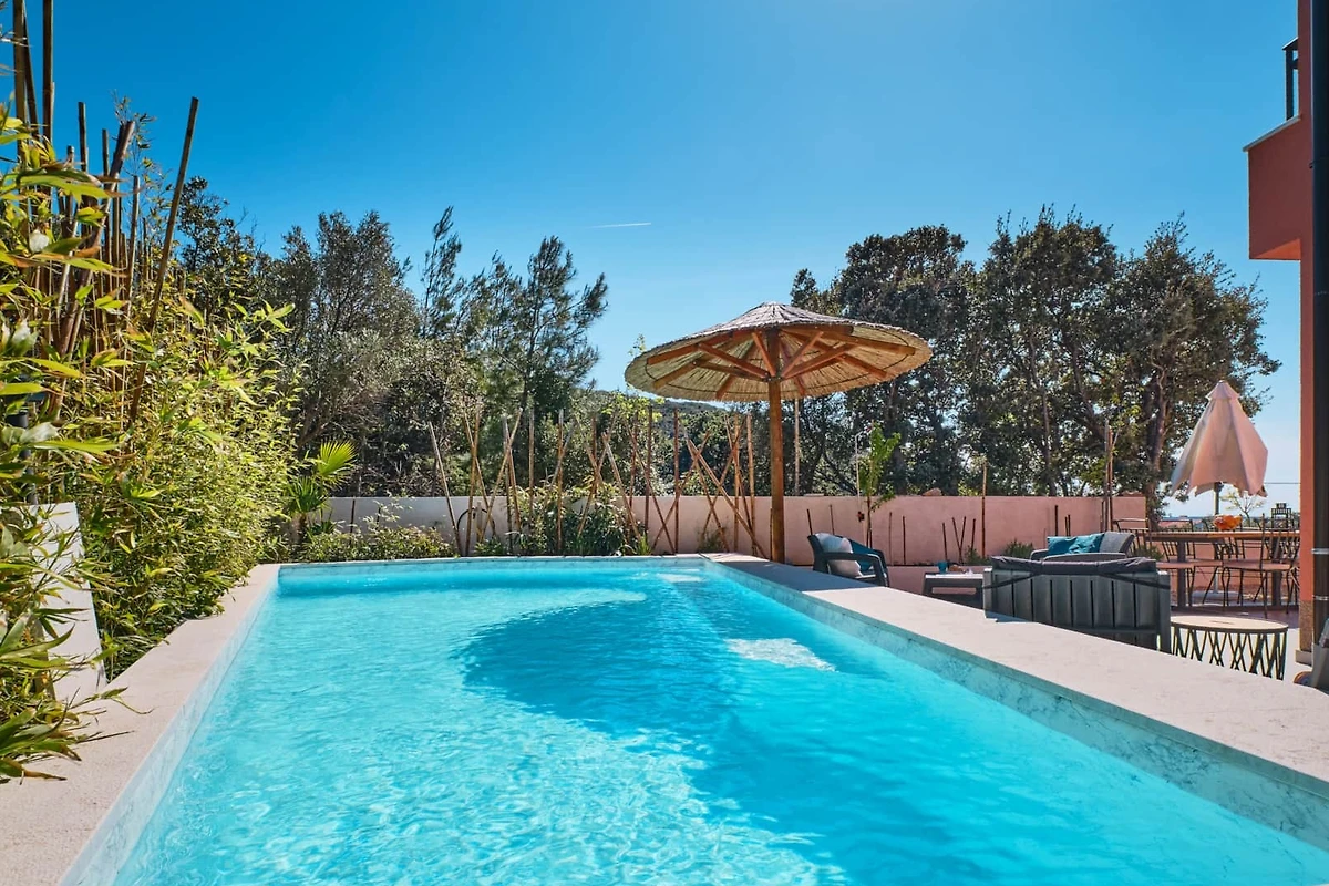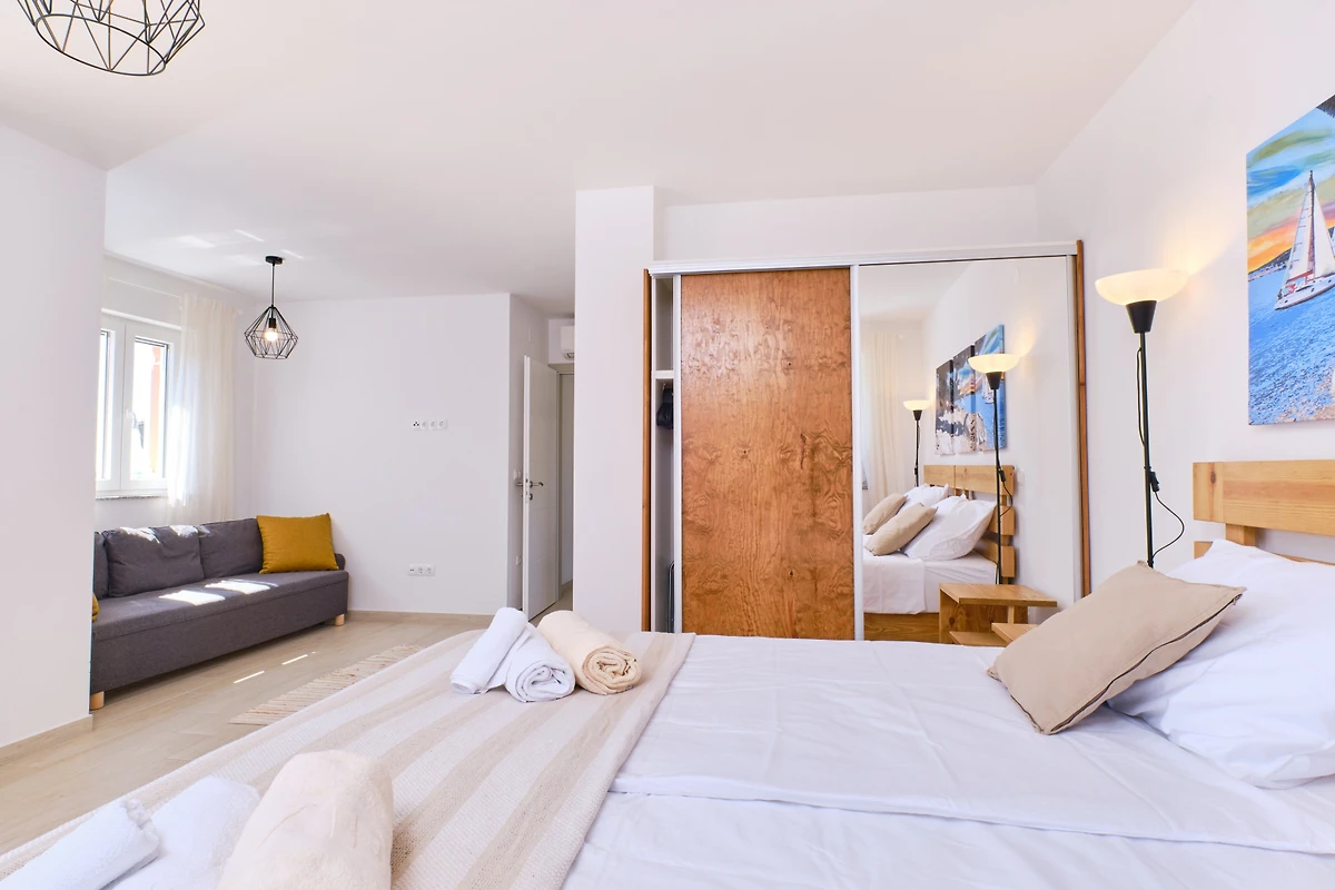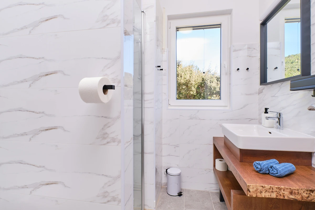 La villa accoglie comodamente fino a 6 ospiti con 2 camere da letto che presentano 2 letti king-size e un divano letto matrimoniale. Tre bagni ben attrezzati con docce garantiscono comodità e privacy per tutti gli ospiti. La cucina moderna in stile americano è completamente attrezzata con cottura a induzione, frigorifero, congelatore, lavastoviglie, forno, macchina da caffè, tostapane e stoviglie complete.