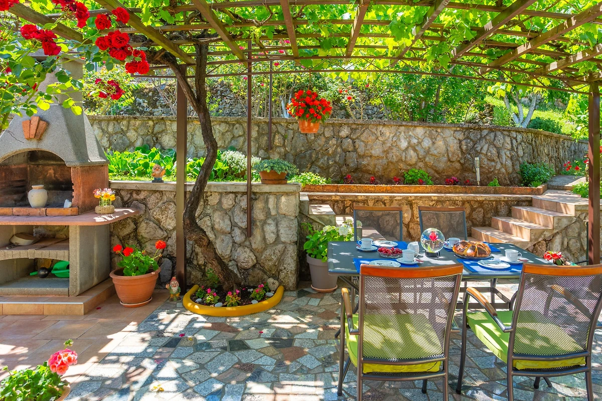 Gli appassionati di attività all'aperto apprezzeranno l'ampio appezzamento di 7000 m² della proprietà, che include un bellissimo giardino, un'area barbecue, un balcone e una terrazza. Godetevi splendide viste sul mare e sul giardino mentre vi rilassate in questo ambiente sereno.