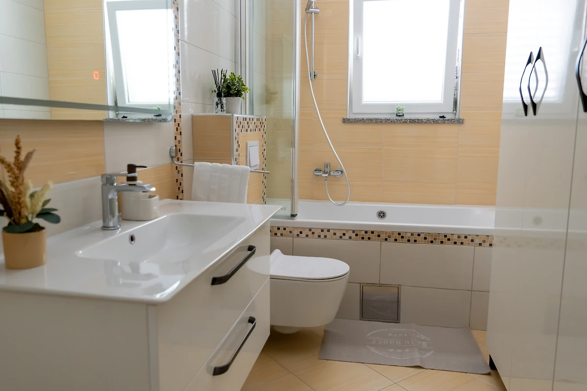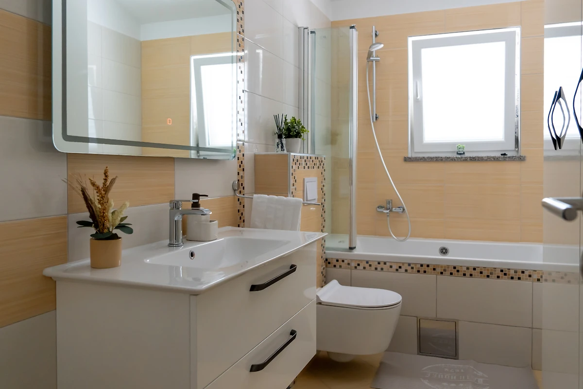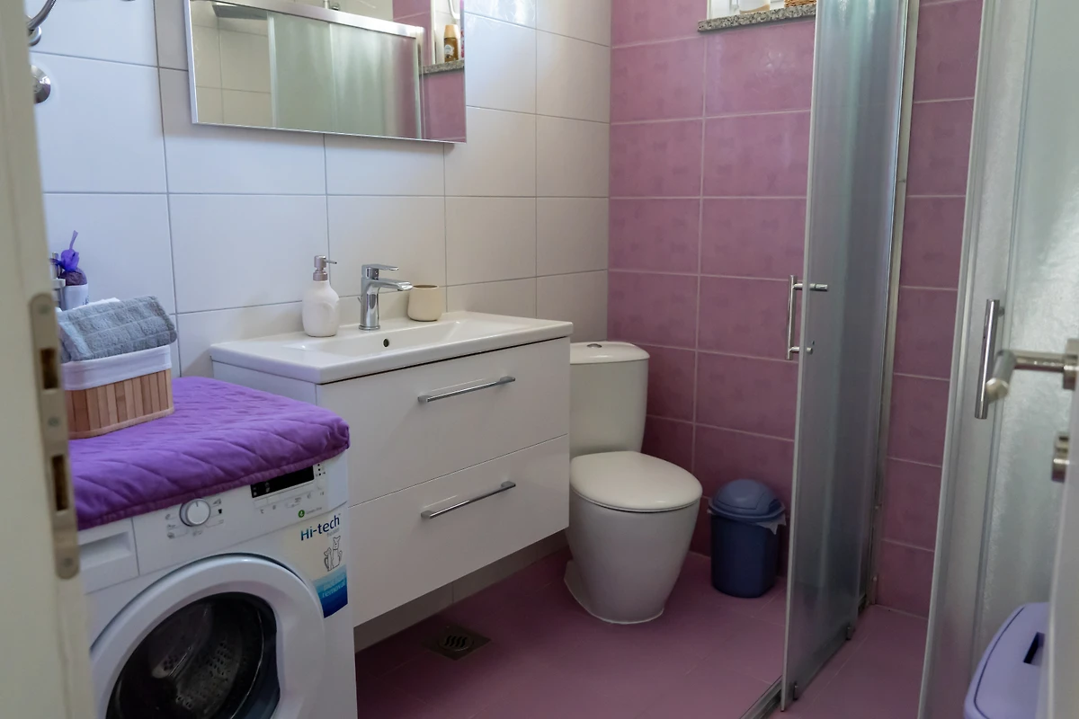 La casa dispone di due bagni - uno con doccia e l'altro con vasca da bagno - garantendo comodità per tutti gli ospiti. Gli ulteriori comfort interni includono l'aria condizionata, un ferro da stiro e accessori domestici essenziali per rendere il tuo soggiorno confortevole.