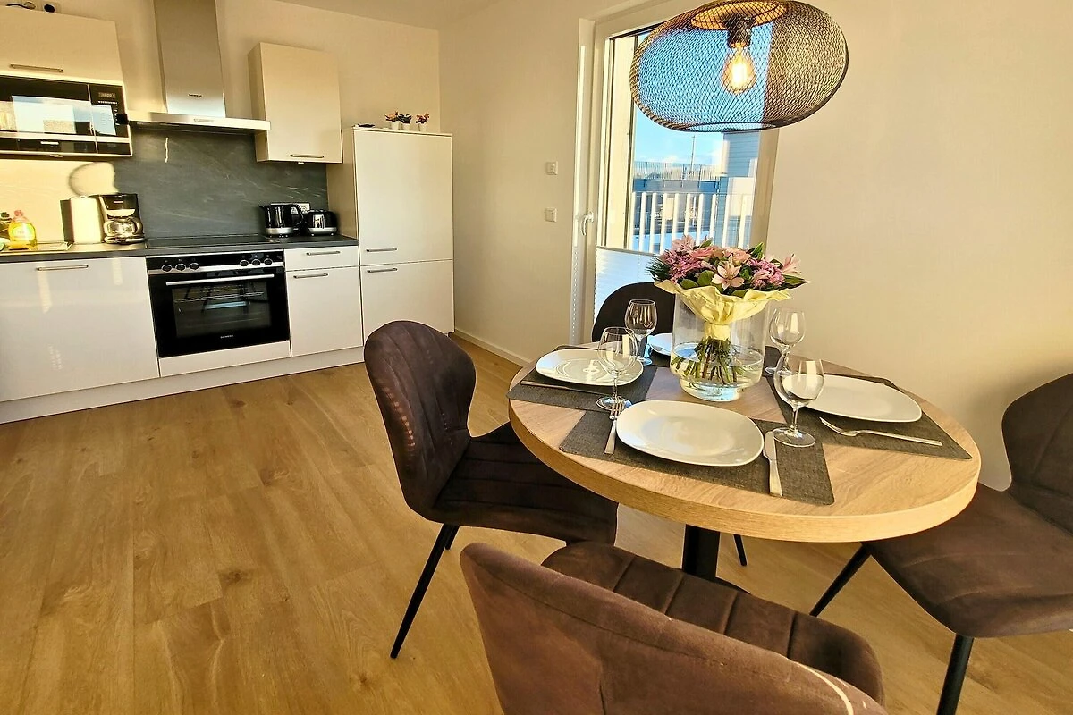 L'appartamento dispone anche di un ampio bagno che, oltre a lavatrice e asciugatrice, ospita anche una cabina a infrarossi per due persone. Il soggiorno offre accesso all'ampio balcone, attrezzato con mobili da giardino fuori dalla stagione invernale. Se gli ospiti non desiderano dormire nell'ampia camera da letto, che può ospitare fino a quattro persone, possono utilizzare il divano in soggiorno. Nell'armadio del soggiorno sono disponibili giochi per gli ospiti e libri da colorare per i bambini. Tutte le finestre della proprietà sono dotate di tripli vetri.