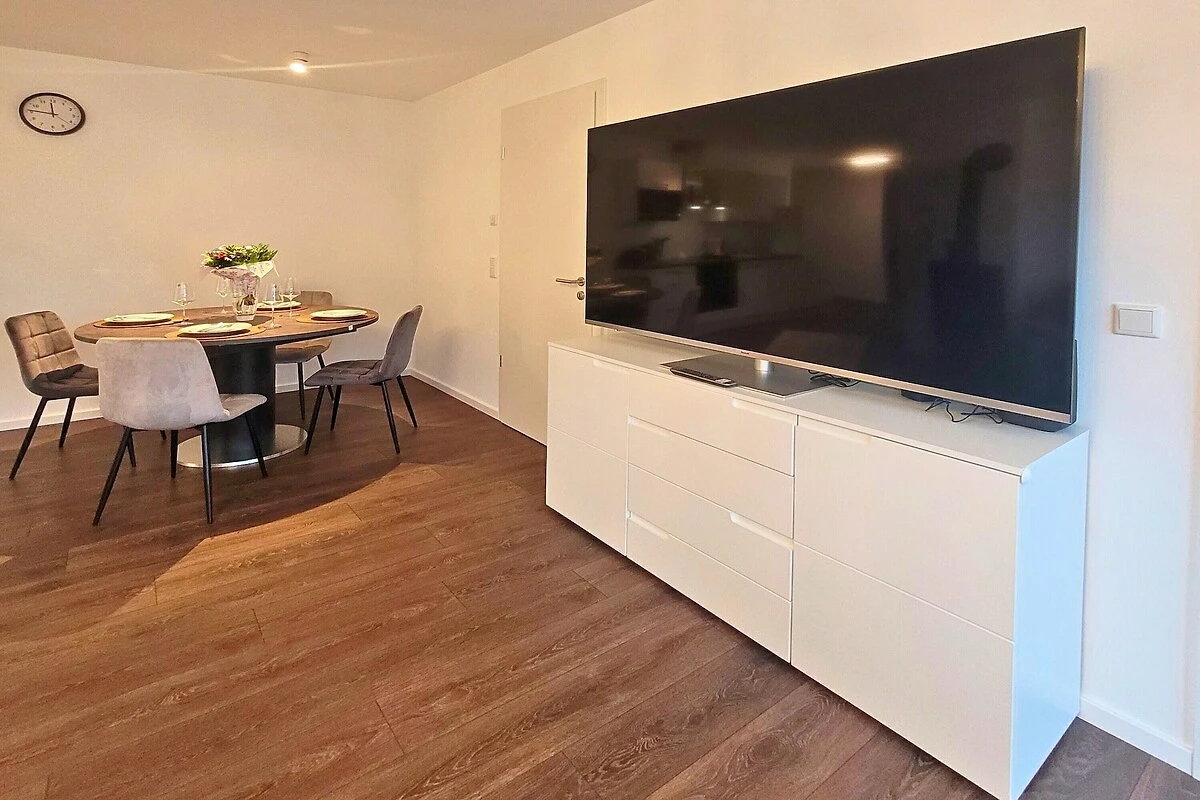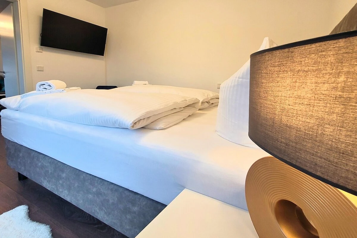 Internamente, l'appartamento dispone di un accogliente soggiorno con divano letto singolo, TV e zona pranzo. La moderna cucina è completamente attrezzata con forno, microonde, macchina da caffè e lavastoviglie, ideale per preparare i pasti dopo una giornata di divertimento all'aria aperta. Due accoglienti camere da letto dispongono ciascuna di un letto matrimoniale e di una TV, offrendo privacy e comfort per un massimo di quattro persone. Il bagno è dotato di doccia rinfrescante, sauna a infrarossi, asciugacapelli e tutti i comfort essenziali.