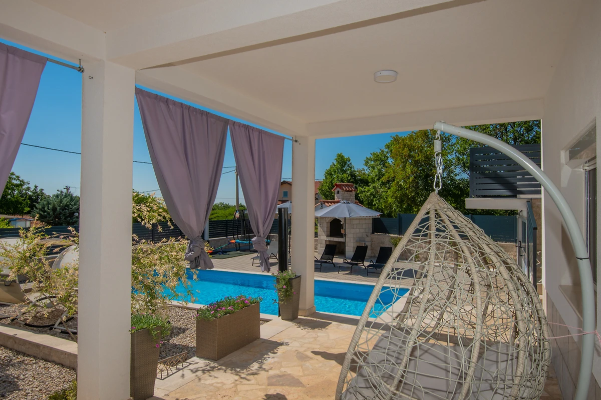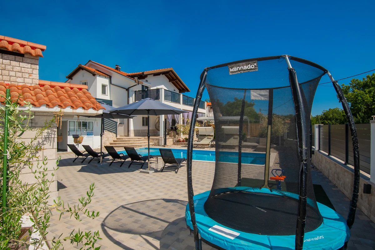 All'esterno, una piscina privata delle dimensioni di 4,5x8 metri invita al relax e al divertimento. Il lotto di 520 metri quadrati include un grazioso giardino, mobili da giardino, un'area barbecue e un perimetro recintato per una maggiore privacy. Goditi la vista delle montagne e della piscina dalla terrazza, perfetta per pranzi all'aperto e per rilassarsi.