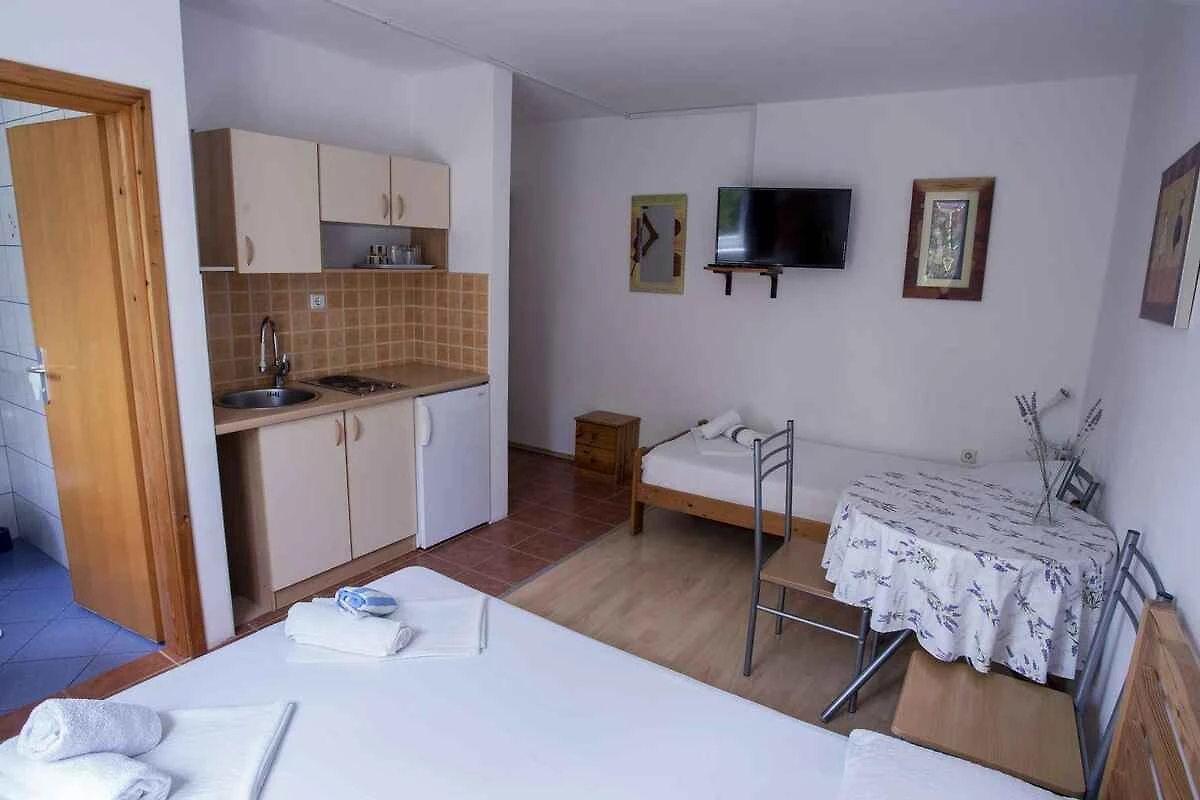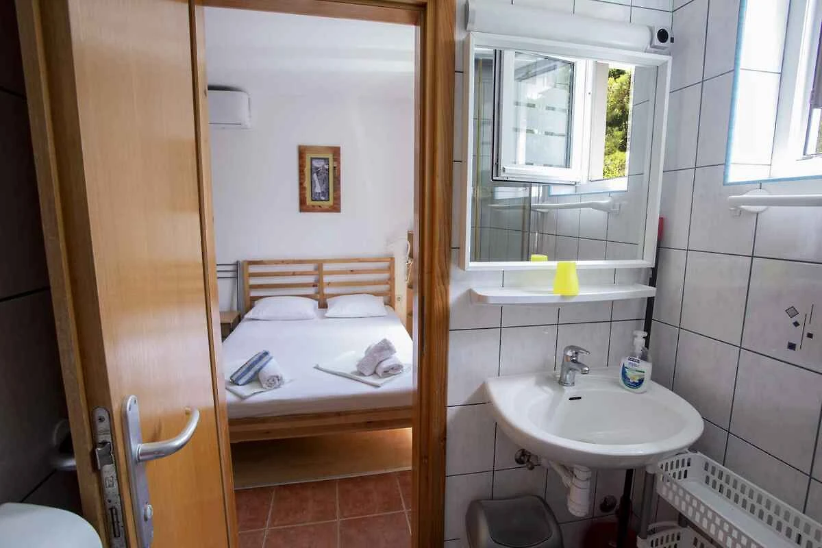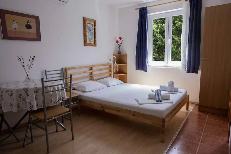 Punat. Lo studio si trova in una trama del giardino chiuso con fiori, delimitata da una recinzione. Il padrone di casa vive stabilmente nella casa, ma usa un ingresso separato. L'accesso avviene direttamente dalla strada principale (asfaltata). Parcheggio (per 1 auto) sulla proprietà.