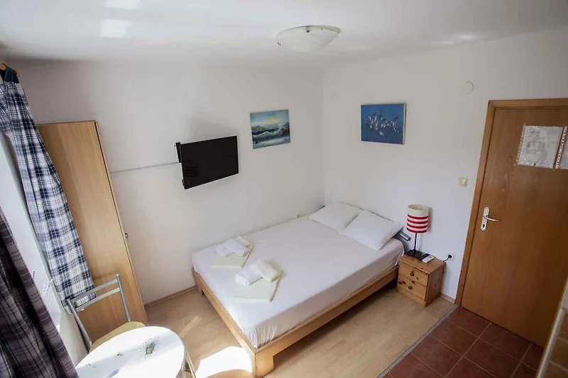 Punat. Lo studio si trova in una trama del giardino chiuso con fiori, delimitata da una recinzione. Il padrone di casa vive stabilmente nella casa, ma usa un ingresso separato. L'accesso avviene direttamente dalla strada principale (asfaltata). Parcheggio (per 1 auto) sulla proprietà.