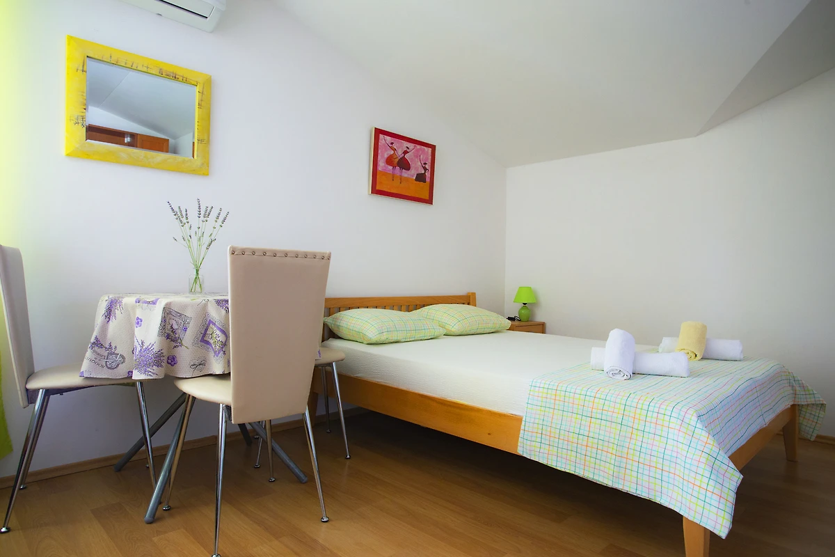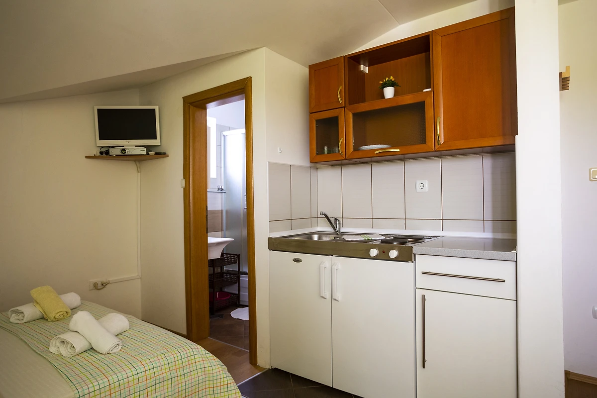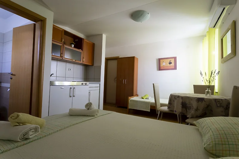Lo studio si trova in un appartamento casa ed è arredato in stile tradizionale. La proprietà si trova in periferia. Anche a causa della vista dalla struttura sul mare e tranquilla e soleggiata posizione, il domicilio è popolare. Attrezzature in comune: possibilità di grigliare, terrazza e fattoria.