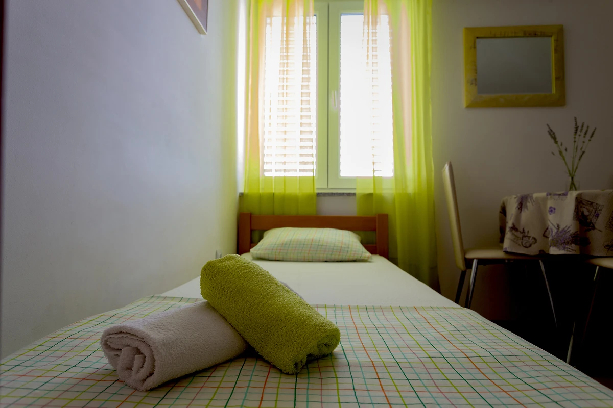 Punat. Lo studio si trova in una trama del giardino chiuso con fiori, delimitata da una recinzione. Il padrone di casa vive stabilmente nella casa, ma usa un ingresso separato. L'accesso avviene direttamente dalla strada principale (asfaltata). Parcheggio (per 1 auto) sulla proprietà.