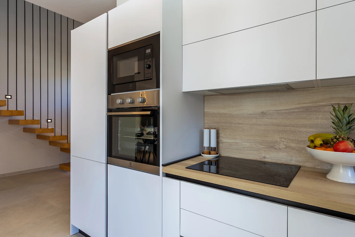 La villa vanta una cucina in stile americano moderno completamente attrezzata con elettrodomestici essenziali tra cui un piano cottura a induzione, frigorifero, congelatore, forno, microonde, lavastoviglie, macchina da caffè e tostapane. Gli ospiti apprezzeranno la comodità di stoviglie e piatti forniti per una facile preparazione dei pasti.