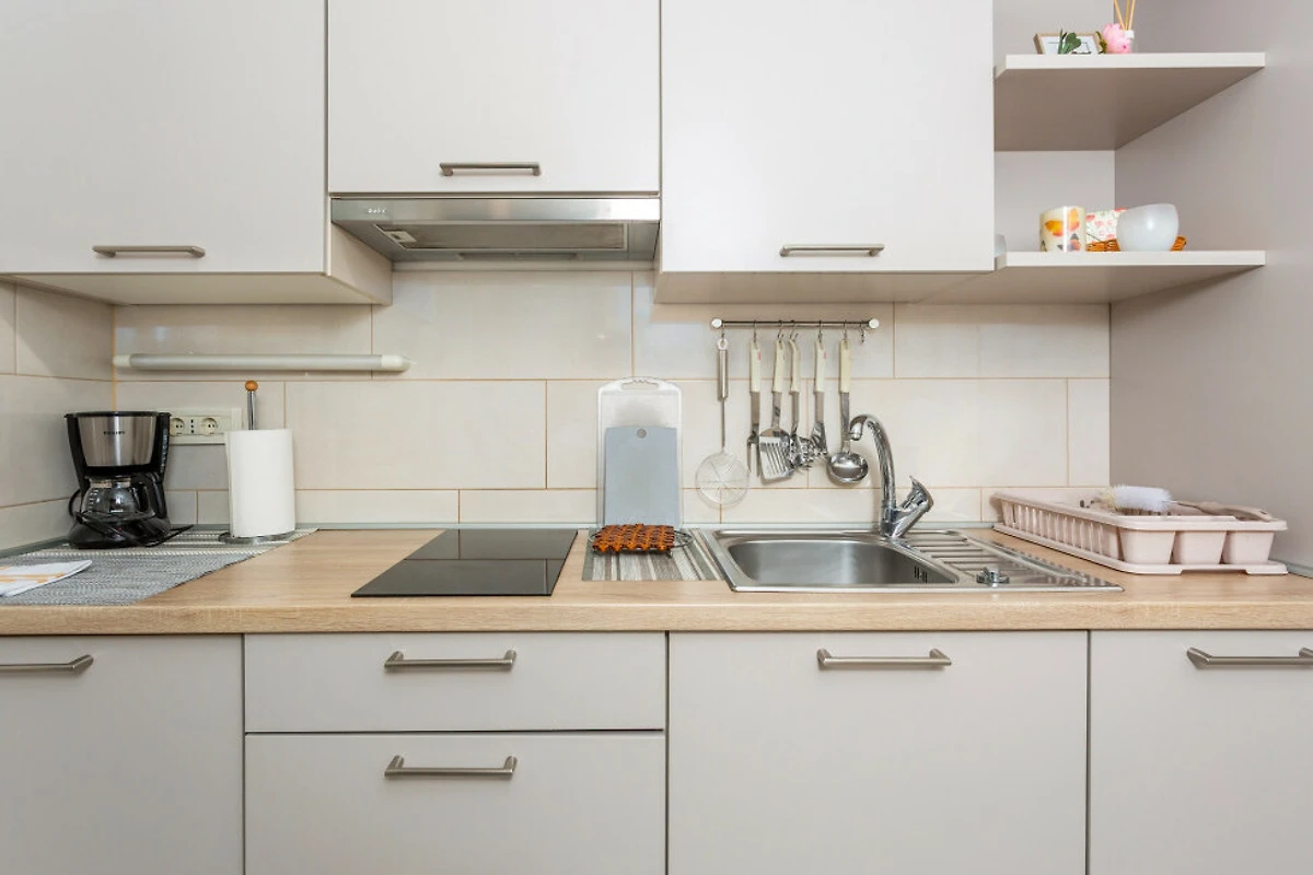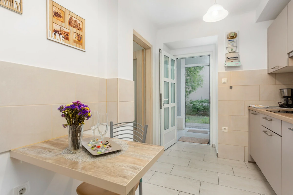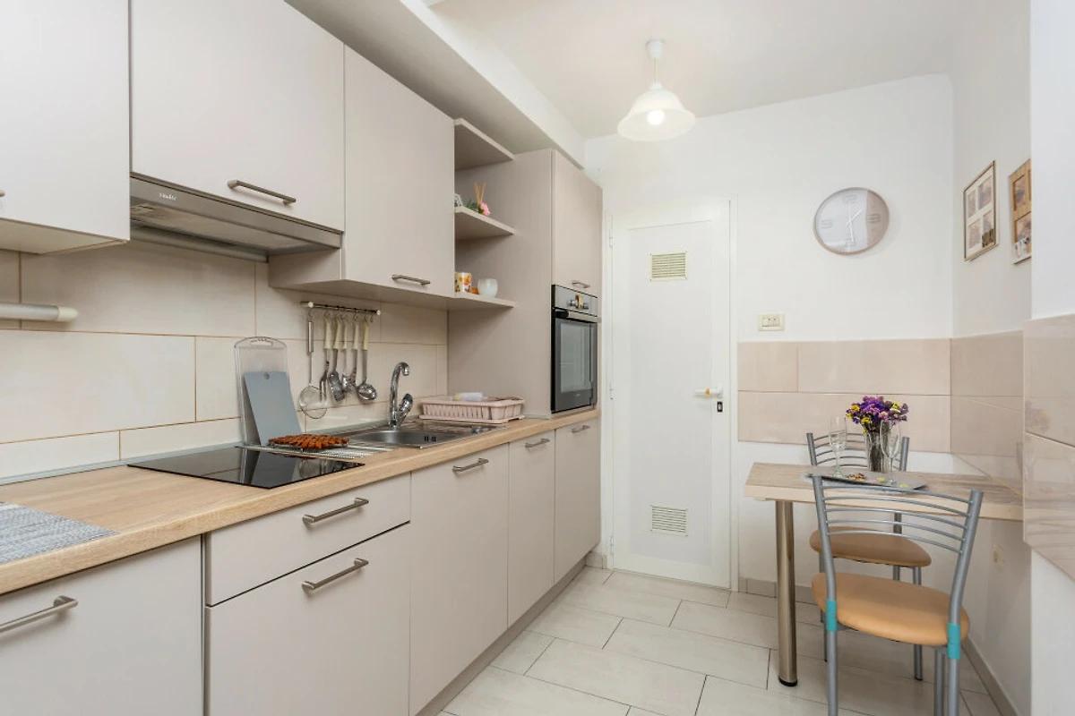 L'appartamento presenta una cucina in stile americano intelligentemente progettata, completamente attrezzata con elettrodomestici moderni, tra cui un piano cottura in vetroceramica, frigorifero, congelatore, forno, macchina da caffè, lavastoviglie e stoviglie complete. La cucina garantisce che tu possa preparare deliziosi pasti con facilità e comodità.