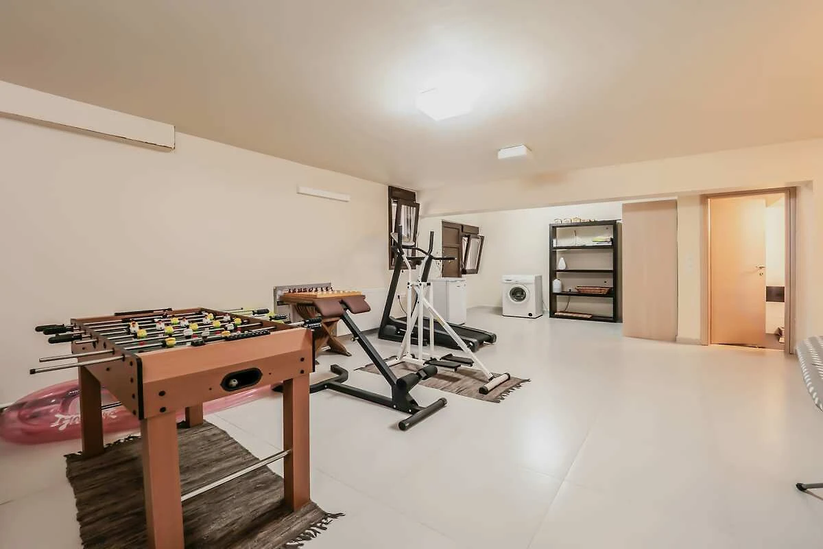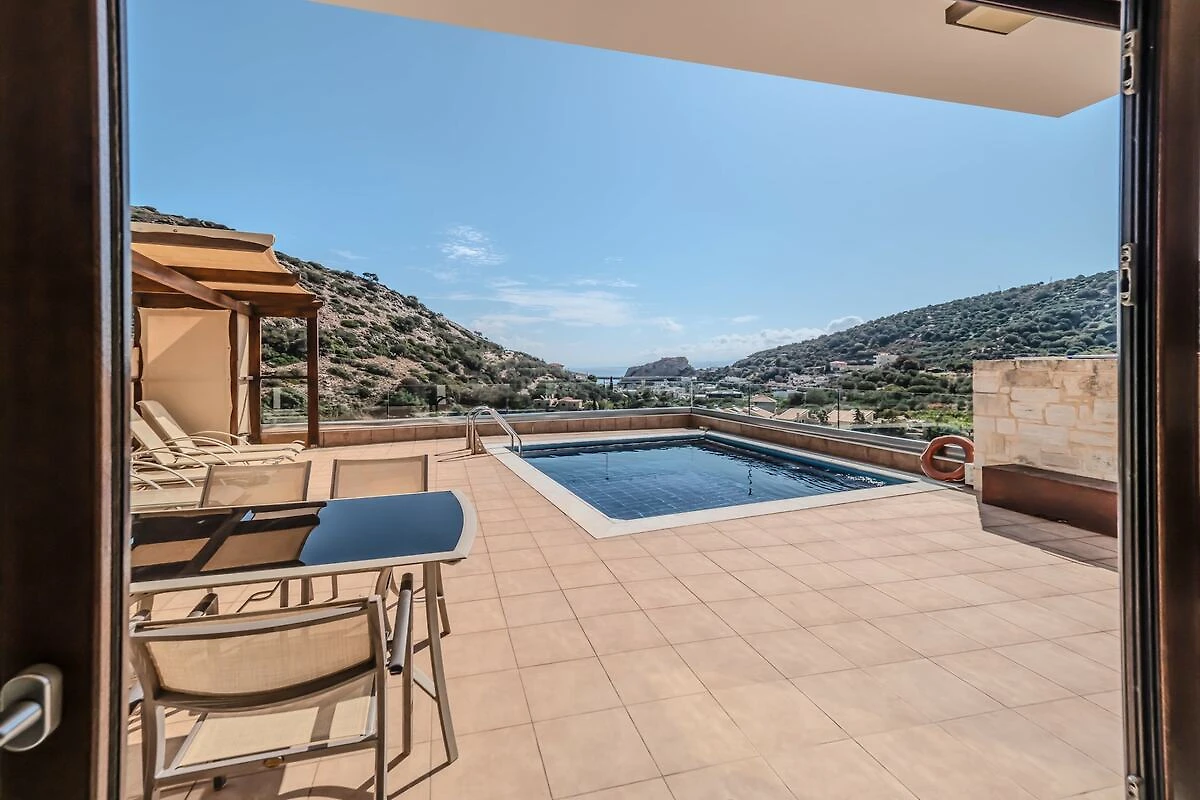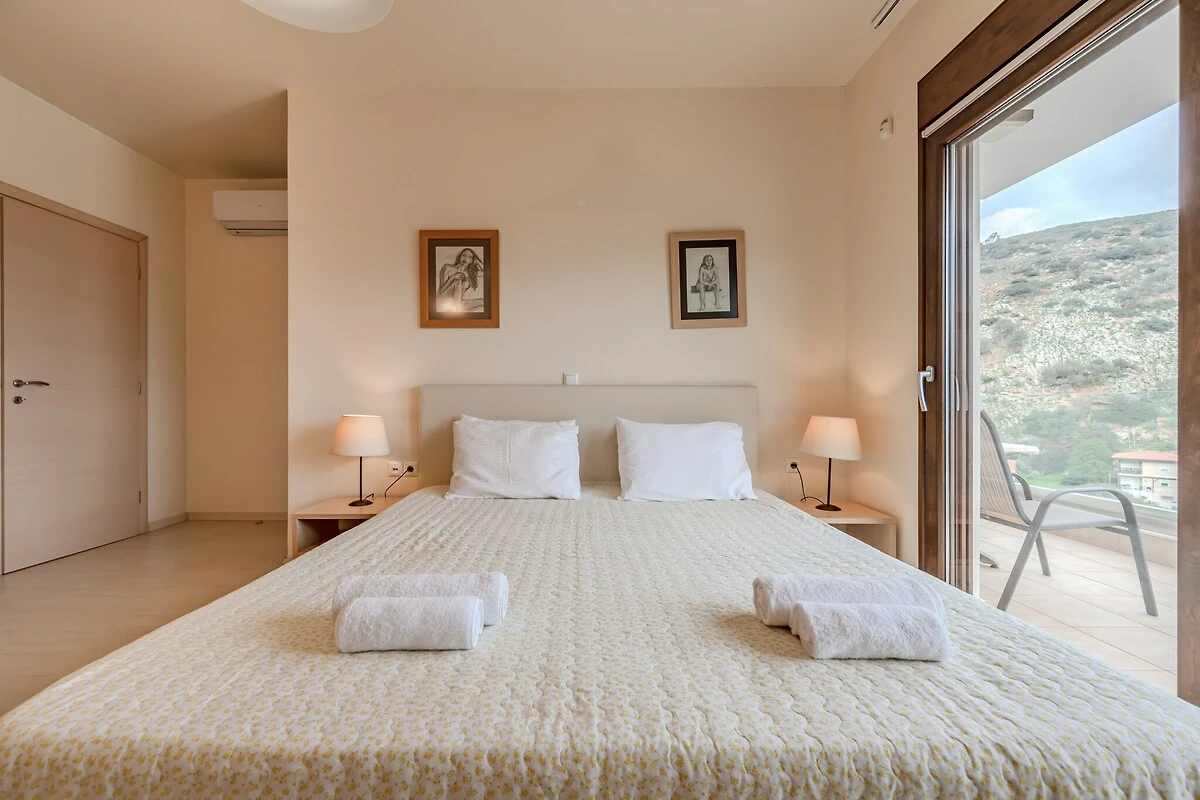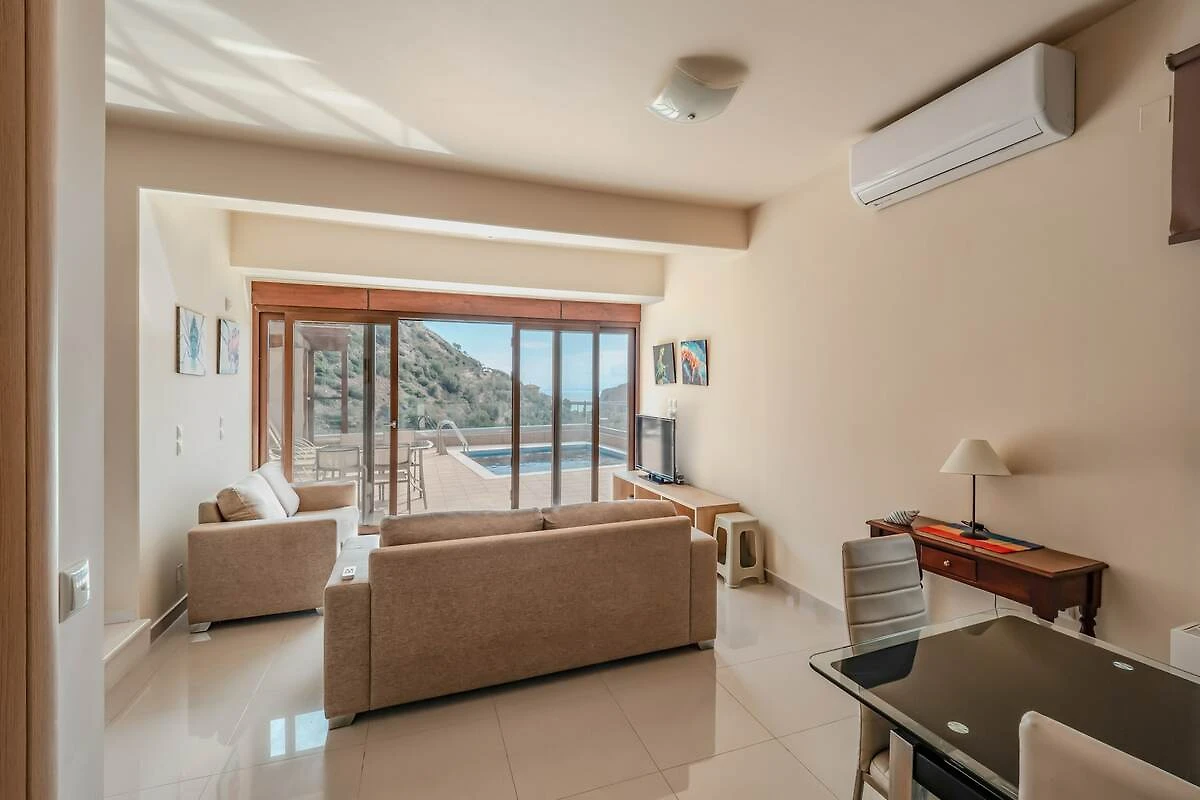 Entrate al piano terra e accedete a un arioso e soleggiato soggiorno open space. L'accogliente soggiorno, completo di una comoda area salotto e di un tavolo da pranzo per sei persone, si fonde armoniosamente con una moderna cucina completamente attrezzata. Qui, siete invitati a preparare e gustare piatti tradizionali cretesi in tutta semplicità. Ampie porte scorrevoli in vetro si aprono su un'ampia veranda, dove troverete un tavolo da pranzo all'aperto e un'accogliente area piscina, che fonde perfettamente la vita interna ed esterna.