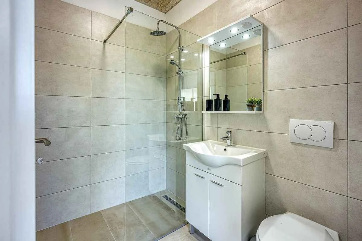 Soggiorno con TV. 3 camere da letto tutto a con 1 letto matrimoniale. Cucina con zona pranzo, stufa a gas, forno, lavastoviglie, frigorifero (scomparto del ghiaccio), caffettiera, tostapane e bollitore elettrico. 2 bagni tutto a con doccia, 1 lavandino e WC. Bagno con doccia, 1 lavandino, WC e asciugacapelli.