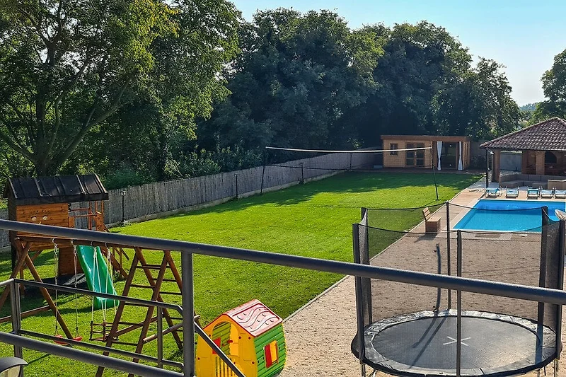 Gli appassionati di attività all'aperto ameranno l'ampio appezzamento di 1300 m², completo di giardino privato, mobili da giardino, area barbecue e una spaziosa terrazza. Il punto di forza è la piscina privata da 8x4 metri, perfetta per rinfrescanti tuffi e pomeriggi di relax.