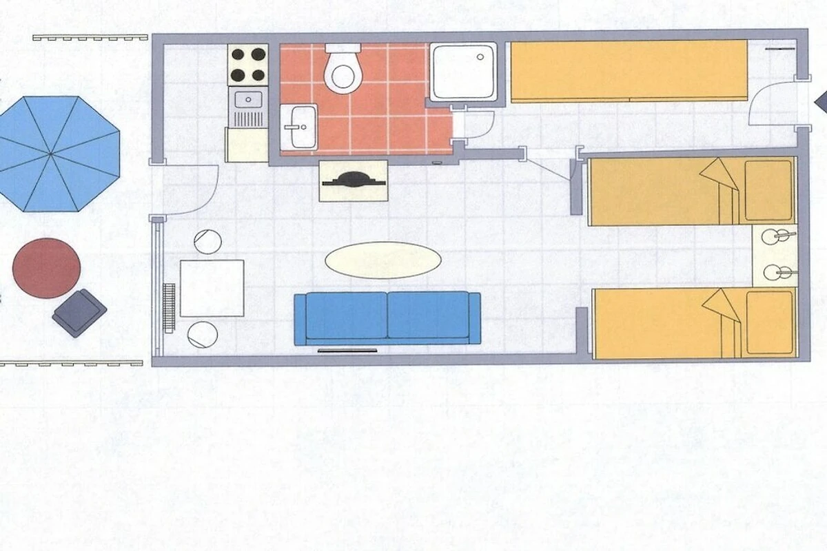 Pianterreno: (Soggiorno/camera da letto(, , , , , , , , , , Armadio cucina, biblioteca, letto singolo, letto singolo, divano letto singolo, TV, tavolo da pranzo, radio, bollitore, tostapane, mobile cucina, caffettiera, forno, forno a microonde, lavastoviglie, frigorifero), Bagno(, Bagno di servizio, doccia, lavandino))