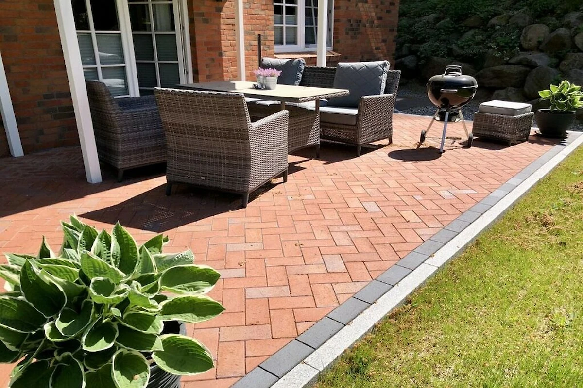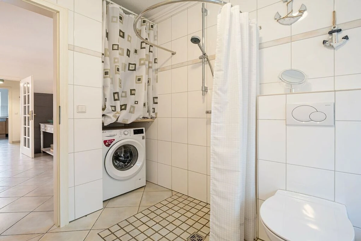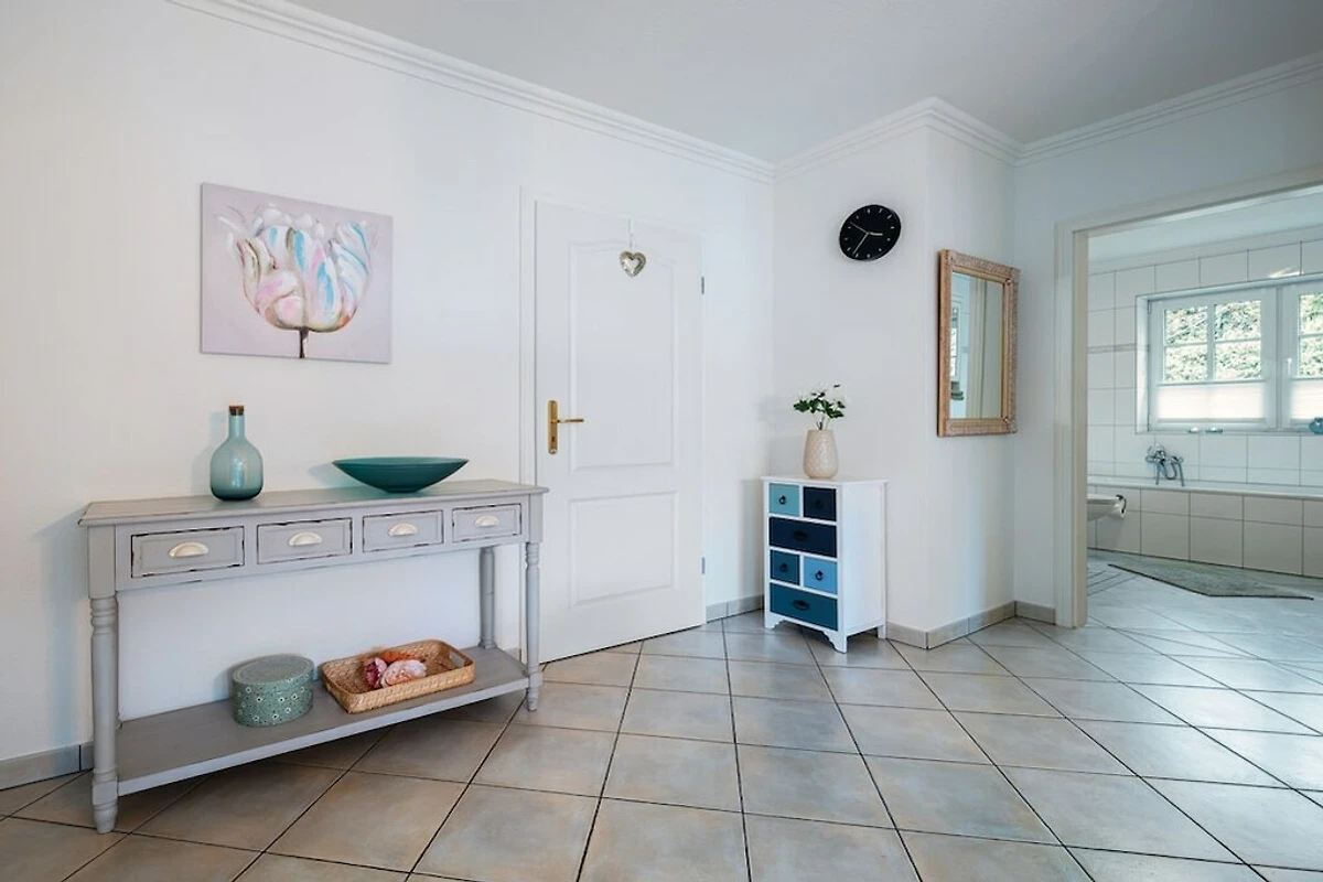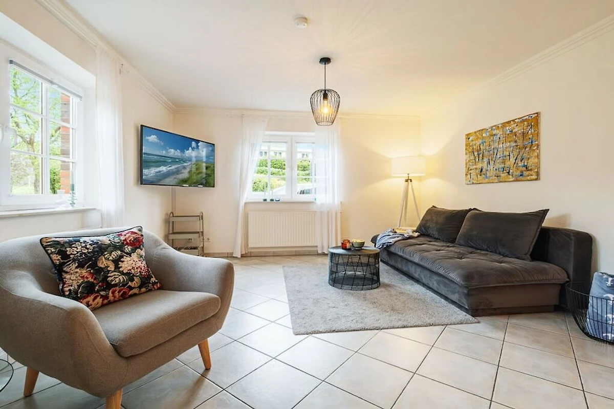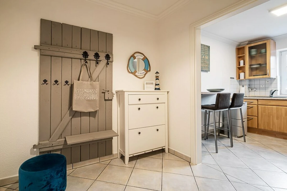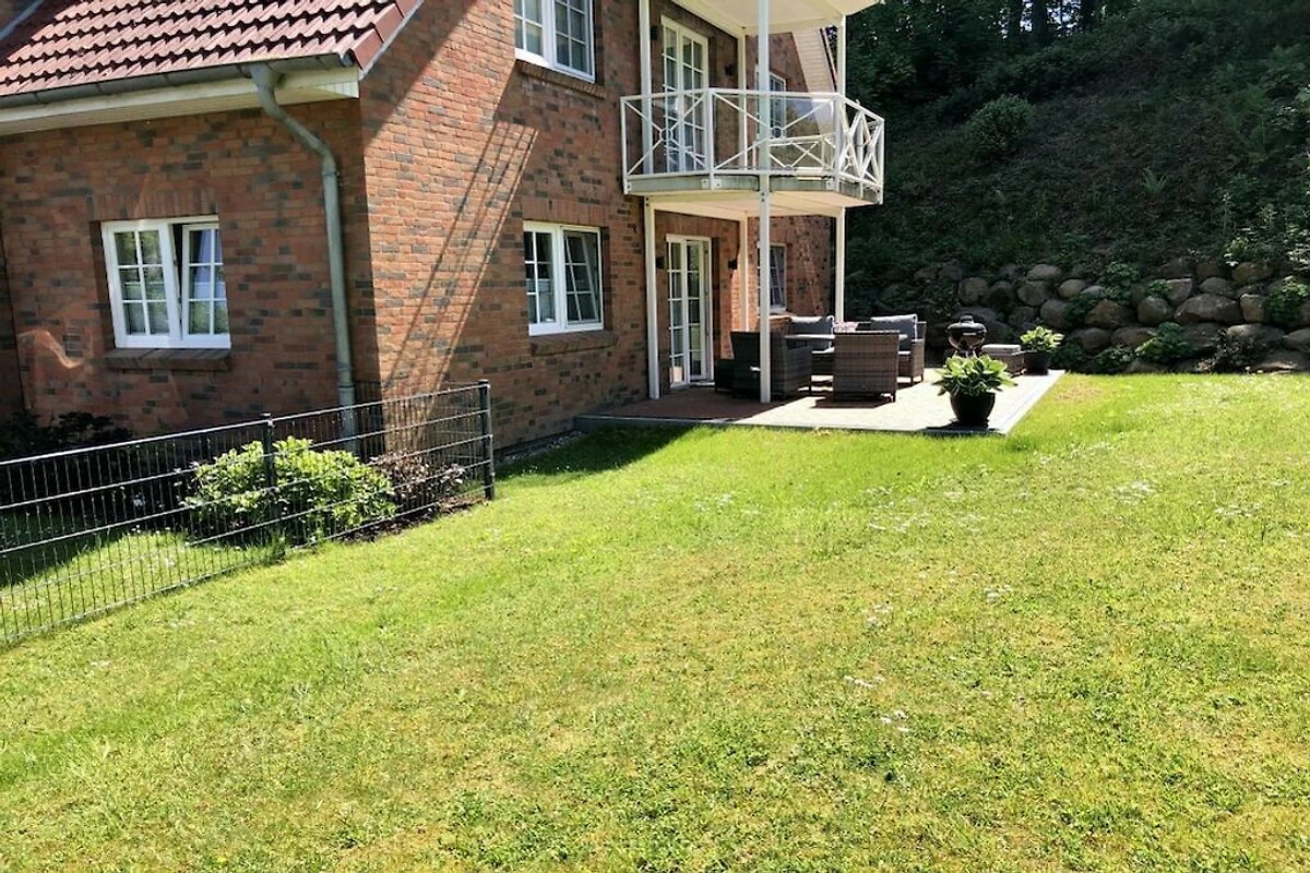 Questo splendido bilocale è elegantemente arredato con tonalità naturali e linee pulite e offre tutto il necessario per una vacanza al mare davvero piacevole. L'ampia zona giorno/pranzo con divano letto (140 x 200 cm), Smart TV e un grande tavolo da pranzo per 4 persone è il punto focale dell'appartamento. Qui troverete spazio per trascorrere ore piacevoli e condividere i pasti, che possono essere preparati nella cucina completamente attrezzata. Da qui si accede alla terrazza solarium e al giardino privato. La camera da letto, arredata con gusto, dispone di un ampio armadio e di un comodo letto a molle (160 x 200 cm) per dormire e sognare. Il moderno bagno con vasca, doccia senza barriere e lavatrice è dotato di riscaldamento a pavimento e finestre con luce naturale.