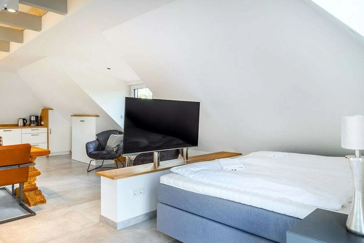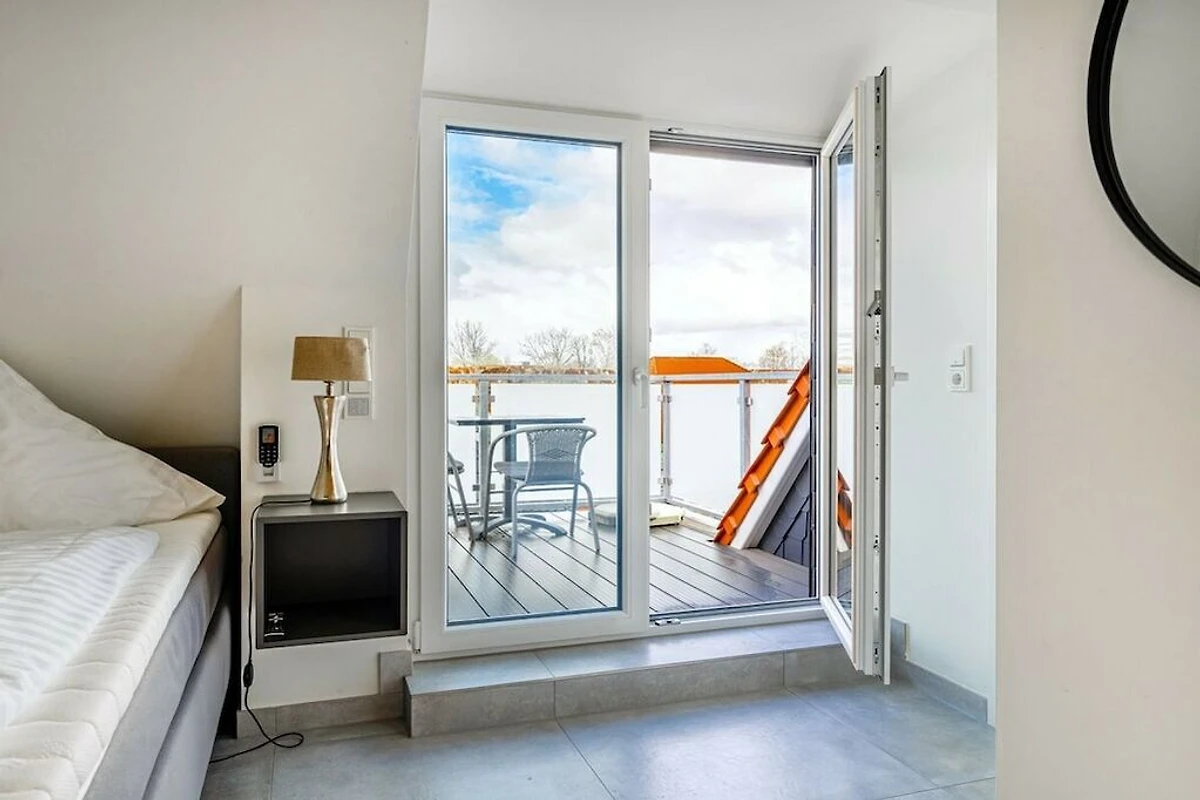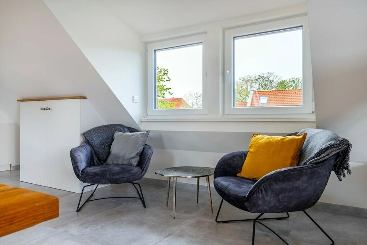 "Piccolo ma perfetto": questa è la descrizione migliore del nostro appartamento per le vacanze "Die Zimmerei 3". Situato in posizione centrale ma tranquilla, l'appartamento si trova all'ultimo piano di una casa con un totale di cinque unità abitative. La luminosa zona giorno di circa 35 metri quadrati, progettata in stile loft con camera da letto e soggiorno aperti, dispone di una cucina completamente attrezzata, un tavolo da pranzo e un comodo letto a molle. Il bagno, illuminato dalla luce naturale, è progettato in modo pratico e offre una cabina doccia e una lavatrice. Dalla camera da letto si accede alla terrazza sul tetto con vista su Greetsiel, un luogo ideale per fare colazione, prendere il sole e godersi l'aria fresca del nord. Naturalmente, l'appartamento dispone anche di un parcheggio privato nel cortile.