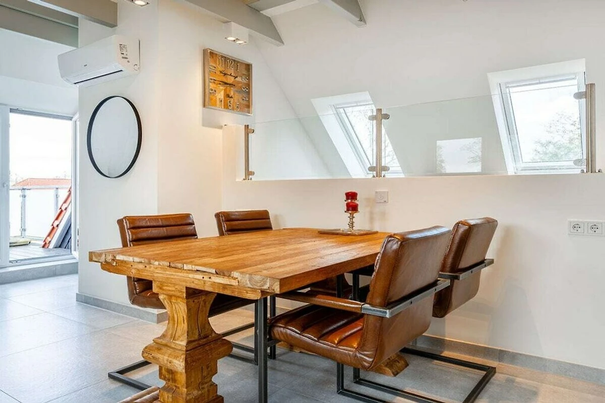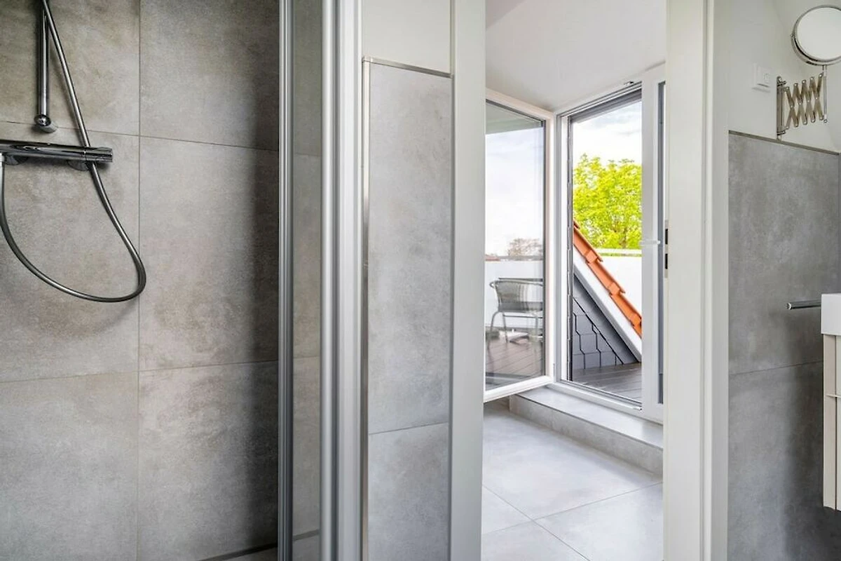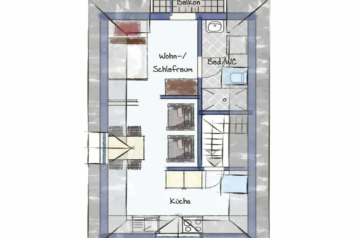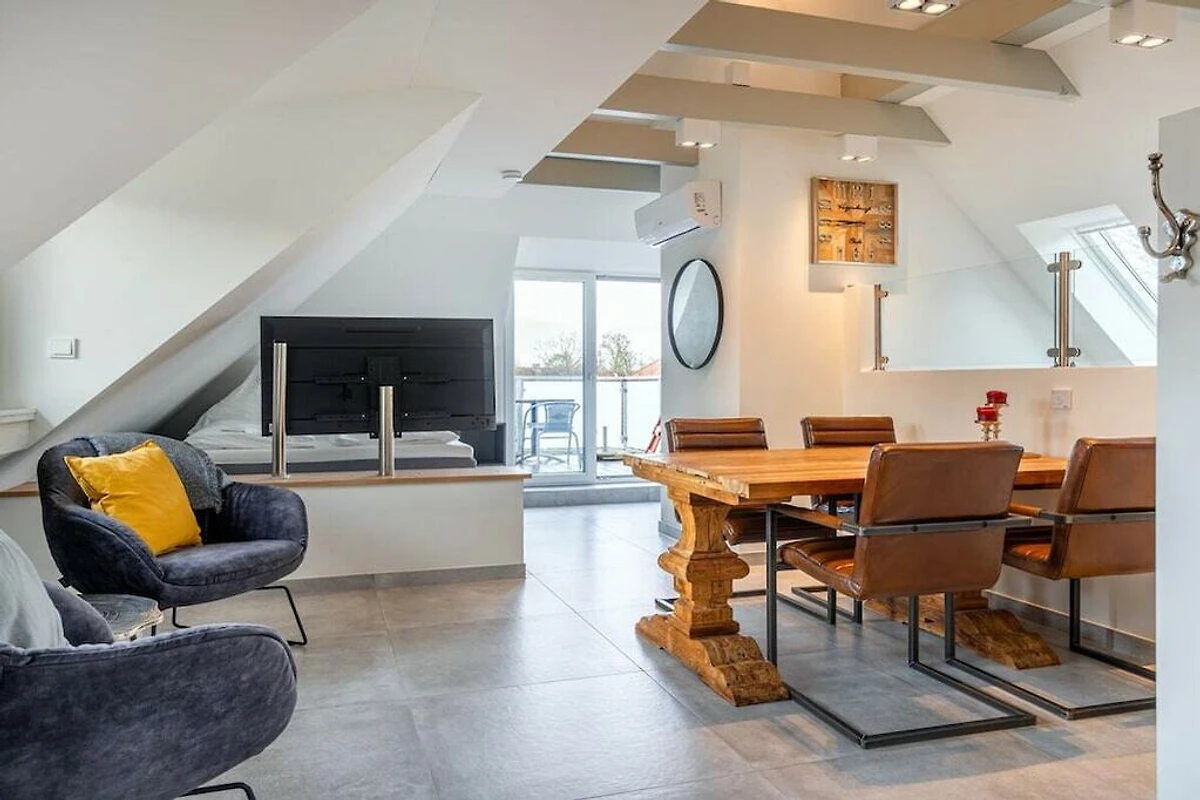 "Piccolo ma perfetto": questa è la descrizione migliore del nostro appartamento per le vacanze "Die Zimmerei 3". Situato in posizione centrale ma tranquilla, l'appartamento si trova all'ultimo piano di una casa con un totale di cinque unità abitative. La luminosa zona giorno di circa 35 metri quadrati, progettata in stile loft con camera da letto e soggiorno aperti, dispone di una cucina completamente attrezzata, un tavolo da pranzo e un comodo letto a molle. Il bagno, illuminato dalla luce naturale, è progettato in modo pratico e offre una cabina doccia e una lavatrice. Dalla camera da letto si accede alla terrazza sul tetto con vista su Greetsiel, un luogo ideale per fare colazione, prendere il sole e godersi l'aria fresca del nord. Naturalmente, l'appartamento dispone anche di un parcheggio privato nel cortile.