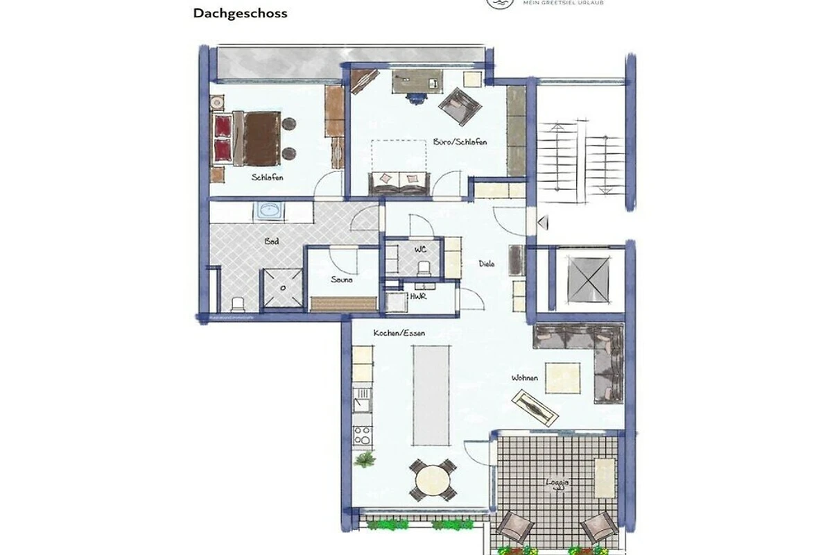 Soffitta: (Corridoio(, , Bagno di servizio, sauna, doccia, lavandino, riscaldamento, asciugacapelli), Cucina separata(Armadio cucina, tavolo da pranzo, piano cottura, bollitore, tostapane, caffettiera, forno, forno a microonde, lavastoviglie, frigorifero, congelatore, riscaldamento), Soggiorno/camera da letto(, divano letto doppio, TV, riscaldamento), Soggiorno / Pranzo(, TV, tavolo da pranzo, riscaldamento), Camera da letto(, , letto matrimoniale, TV, riscaldamento), guest toilet(Bagno di servizio, lavandino), sgabuzzino(asciugabiancheria, lavatrice))