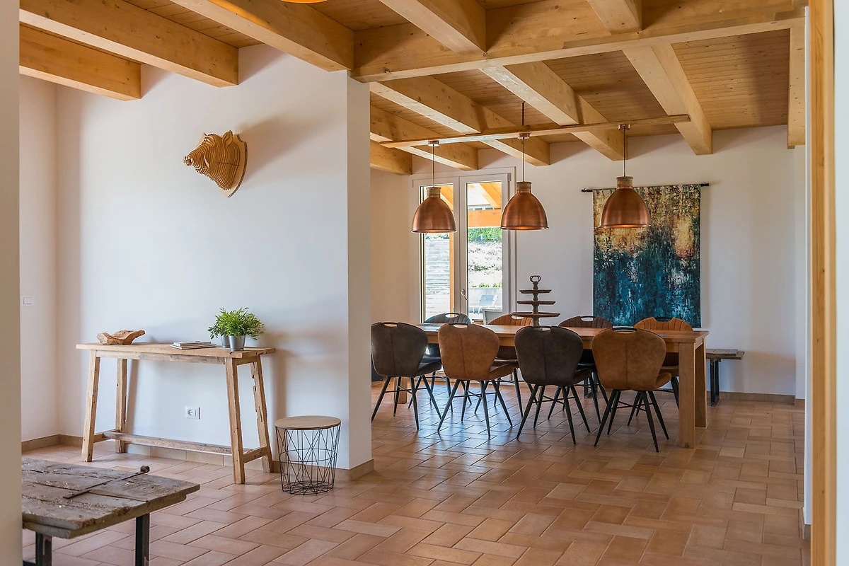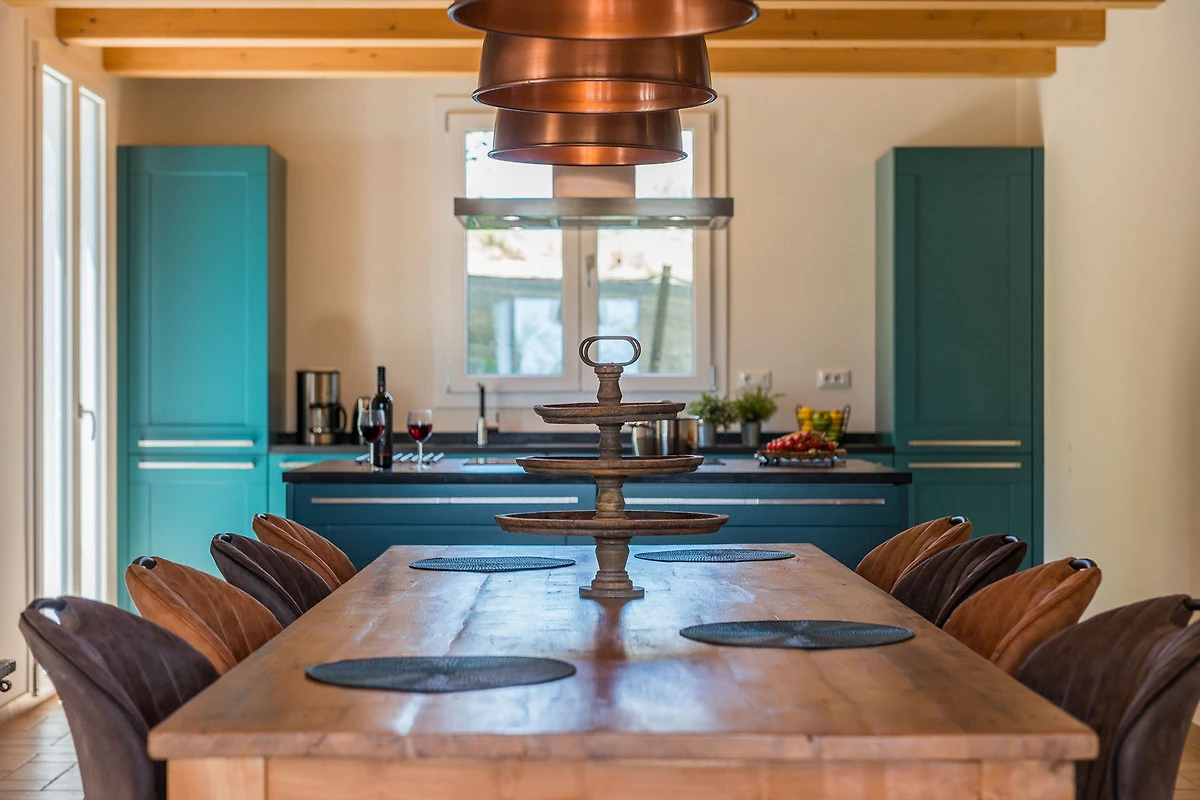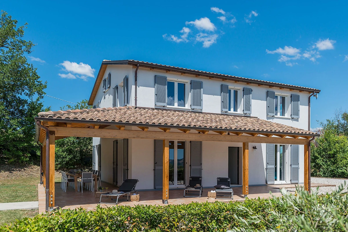 Circondata dalle colline di Sant’Angelo in Pontano nelle Marche, con un panorama che si estende fino ai Monti Sibillini, si trova Villa Teresa, una soluzione abitativa composta da due residenze affiancate e affittabili insieme, per offrire un’esperienza di soggiorno unica. Il centro di Sant’Angelo in Pontano si trova a pochi minuti dalla proprietà, rendendola la base ideale per esplorare il borgo e vivere appieno il fascino genuino del territorio. Tra le mete che meritano una visita vi sono il Lago di Fiastra con i suoi paesaggi naturali e trekking, la città storica di Fermo, le spiagge di Porto San Giorgio e la vivace Civitanova Marche, rinomata per lo shopping e i locali sul mare. Protetto da alberi e vegetazione, l’ambiente è tranquillo e pensato per famiglie numerose o gruppi di amici che desiderano godere sia di riservatezza sia di compagnia reciproca. La piscina privata, incastonata tra le due abitazioni, rappresenta il cuore della proprietà, raggiungibile tramite un vialetto da una casa o una breve scalinata dall’altra. Entrambe le strutture dispongono di ampie zone giorno arredate con uno stile contemporaneo e funzionale. Le cucine, ben attrezzate e affacciate sui portici dotati di tavoli e sedie, sono perfette per cucinare insieme e trasformare ogni pasto in un’esperienza conviviale, a stretto contatto con la natura.