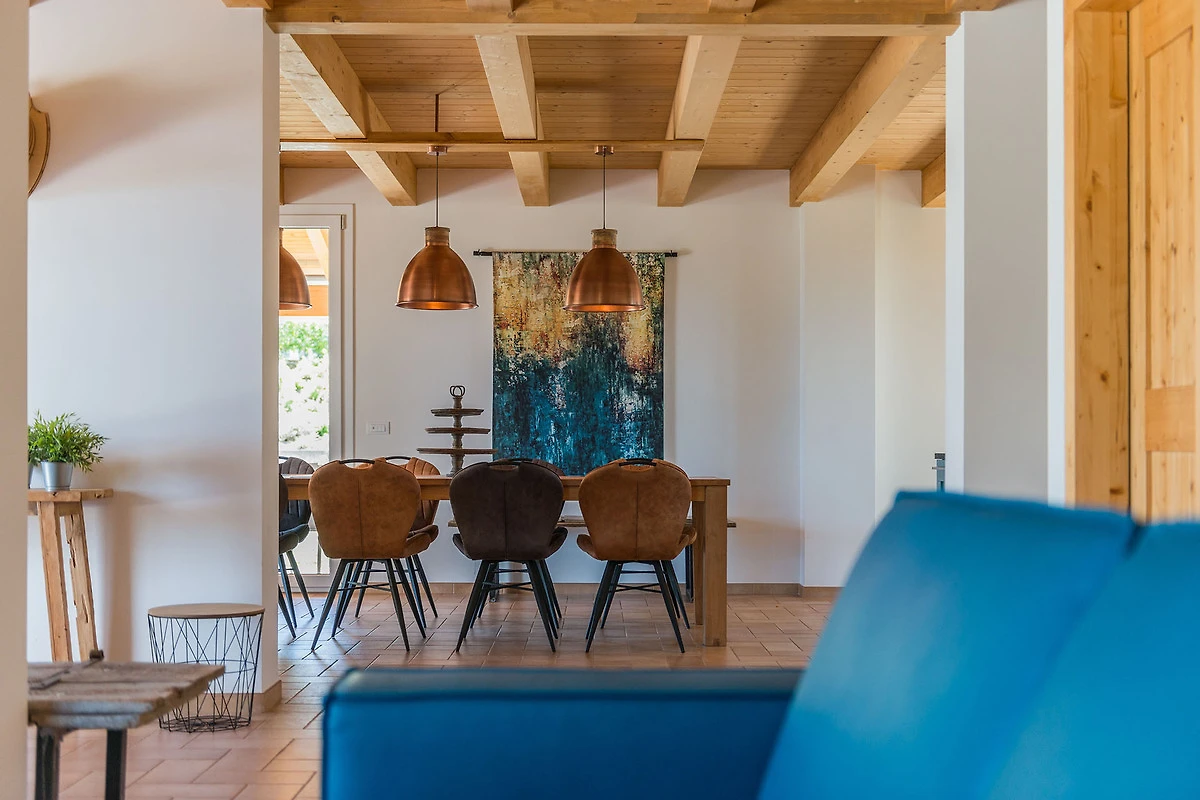 Le due strutture si sviluppano su due piani, garantendo comfort e funzionalità in ogni ambiente. La prima villa al piano terra è composta da un’ampia zona giorno open space con cucina e sala da pranzo, zona divani con tv, un bagno di servizio ed una zona lavanderia. Al primo piano si trovano due camere matrimoniali con bagno en-suite con doccia, una camera doppia, una camera matrimoniale ed un bagno con doccia. La seconda villa è composta al piano terra da un’ampia zona giorno open space con cucina e sala da pranzo, zona divano con tv, un bagno di servizio ed una zona lavanderia. Al primo piano si trovano due camere matrimoniali con bagno en-suite con doccia, due camere matrimoniali, bagno con doccia. Entrambe le abitazioni sono dotate di aria condizionata e zanzariere in tutte le finestre.