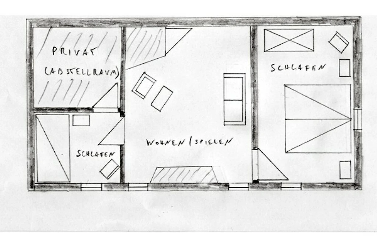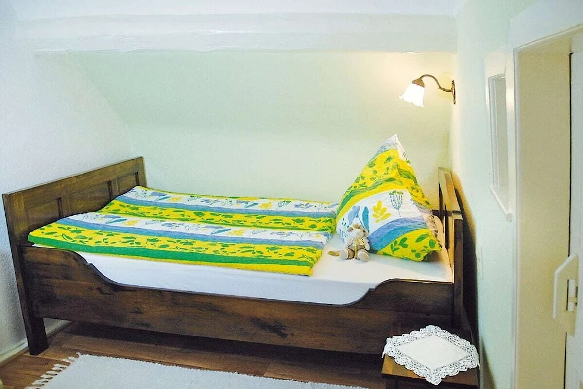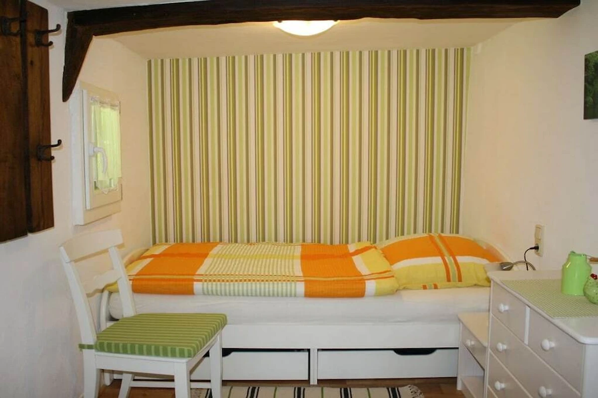 Pianterreno: (Atrio(, , stufa), Soggiorno(, , biblioteca, TV, lettore DVD, lettore DVD), Cucina separata(, , , , , Armadio cucina, tavolo da pranzo, piano cottura, bollitore, tostapane, caffettiera, forno, forno a microonde, lavastoviglie, frigorifero, congelatore, congelatore), Camera da letto(, letto singolo), Bagno(, Bagno di servizio, doccia, lavandino, riscaldamento, asciugacapelli), sgabuzzino(, asse da stiro, ferro da stiro, asciugatoio))