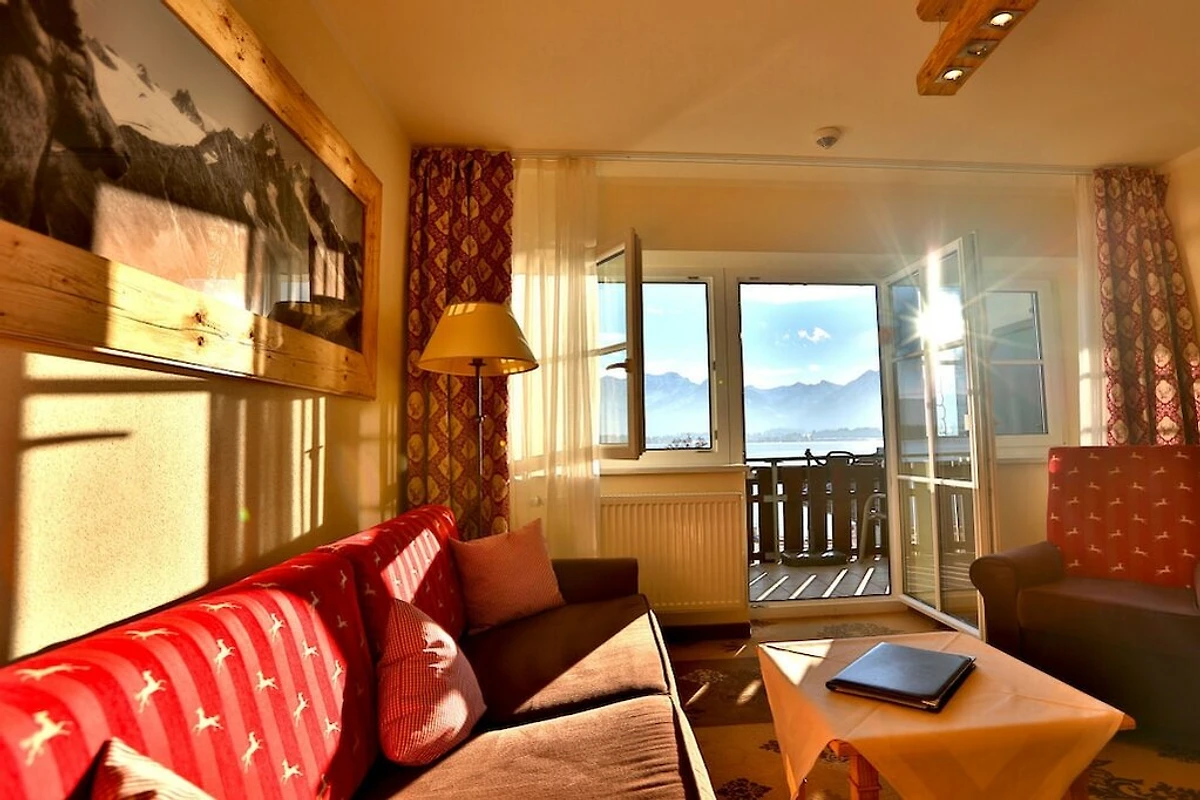 Appartamento "Alpina" bilocale, soggiorno con divano letto matrimoniale (160 x 200 cm) e camera matrimoniale separata, bagno con cabina doccia/WC + asciugacapelli e riscaldamento a pavimento, angolo cottura (completamente attrezzato con lavastoviglie), radio/lettore CD/MP3, 2 TV a schermo piatto con DVD (1 soggiorno + 1 camera da letto), cassaforte, DSL ad alta velocità, telefono e balcone o terrazza con vista mozzafiato sul lago e sulle montagne per 2-4 persone. L'accesso alla nostra area benessere alpina è gratuito!