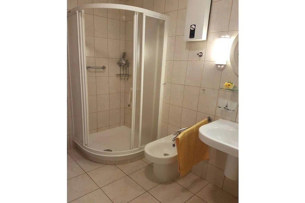 L'appartamento per vacanze al piano superiore è particolarmente consigliato per due persone, poiché una camera da letto, con bagno, WC e doccia, è separata da un corridoio e da una porta separata, creando così un appartamento separato, praticamente un appartamento separato.