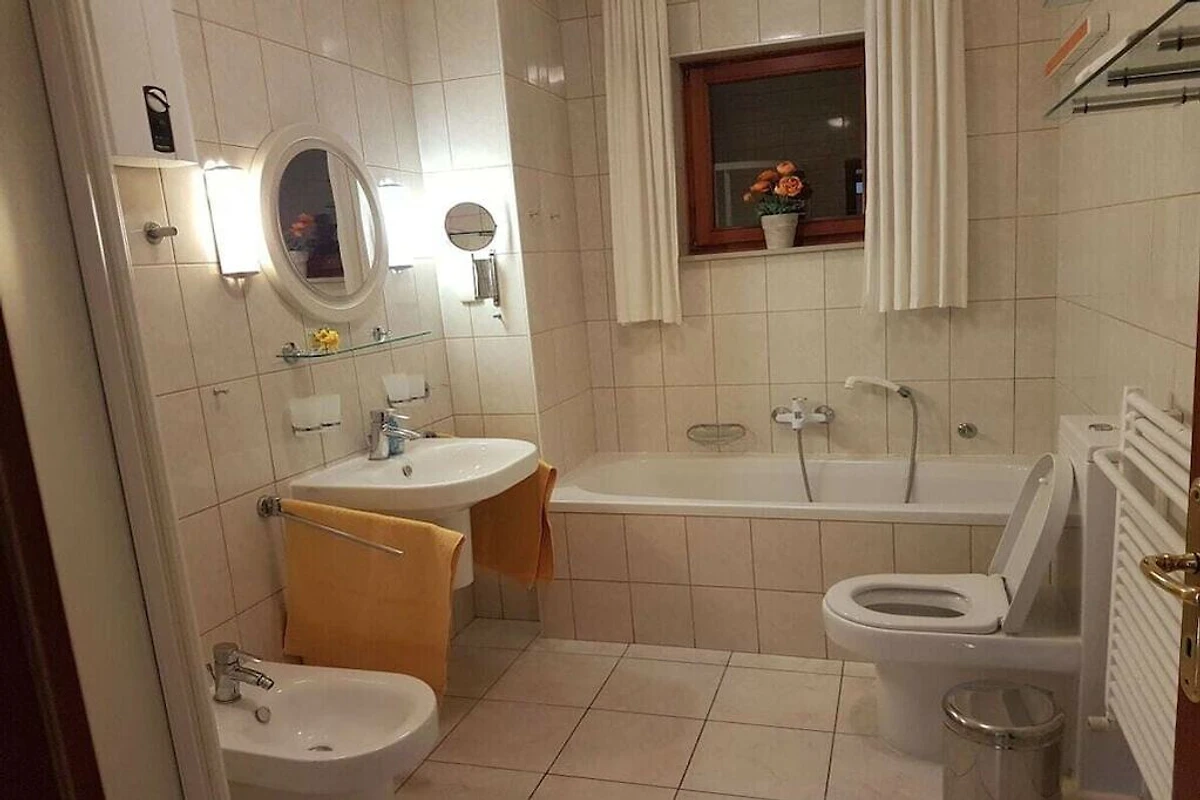 L'ampio bagno è dotato di vasca, doccia, bidet, WC e lavandino.