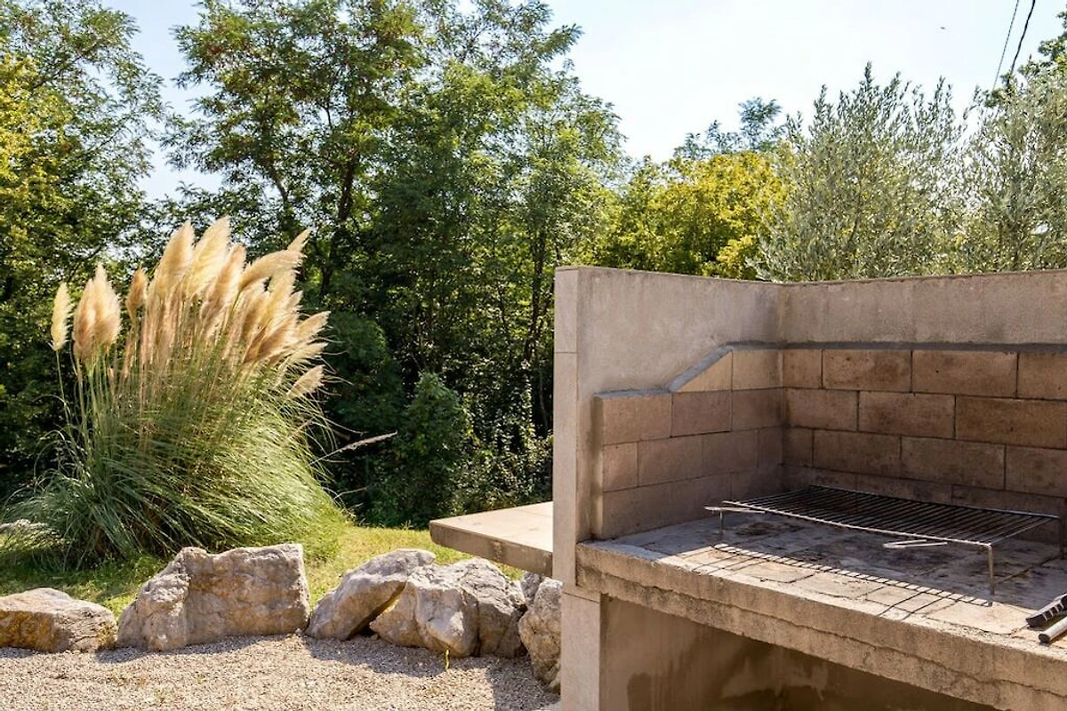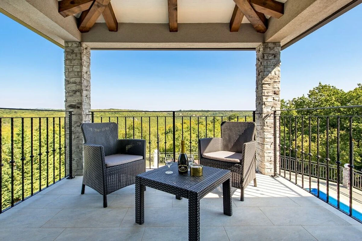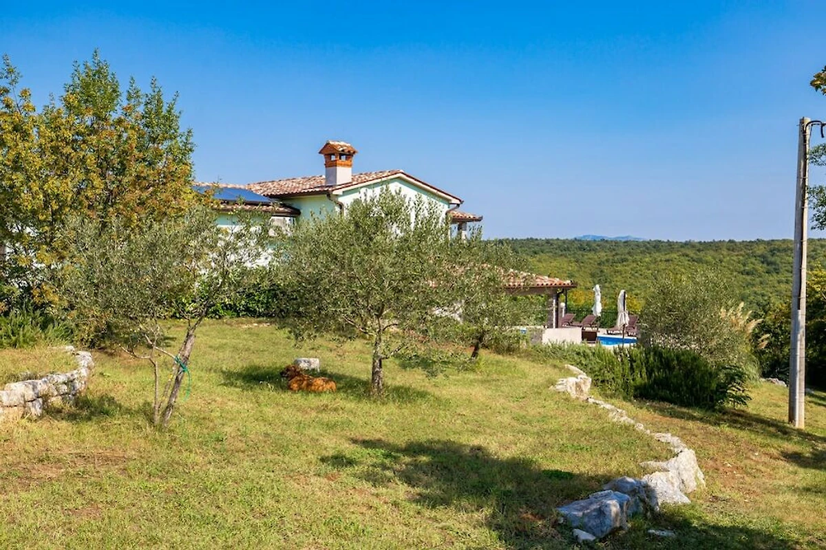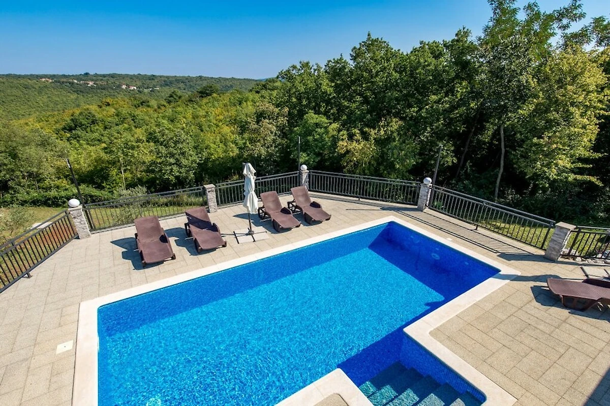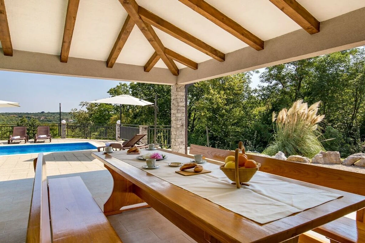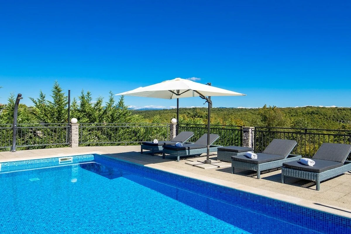 L'ampio spazio esterno ospita una piscina privata all'aperto circondata da lettini e ombrelloni. Dalla piscina, gli ospiti possono godere di una vista mozzafiato sul verde circostante e sul cielo terso. La terrazza dispone di una zona pranzo all'aperto con barbecue.
