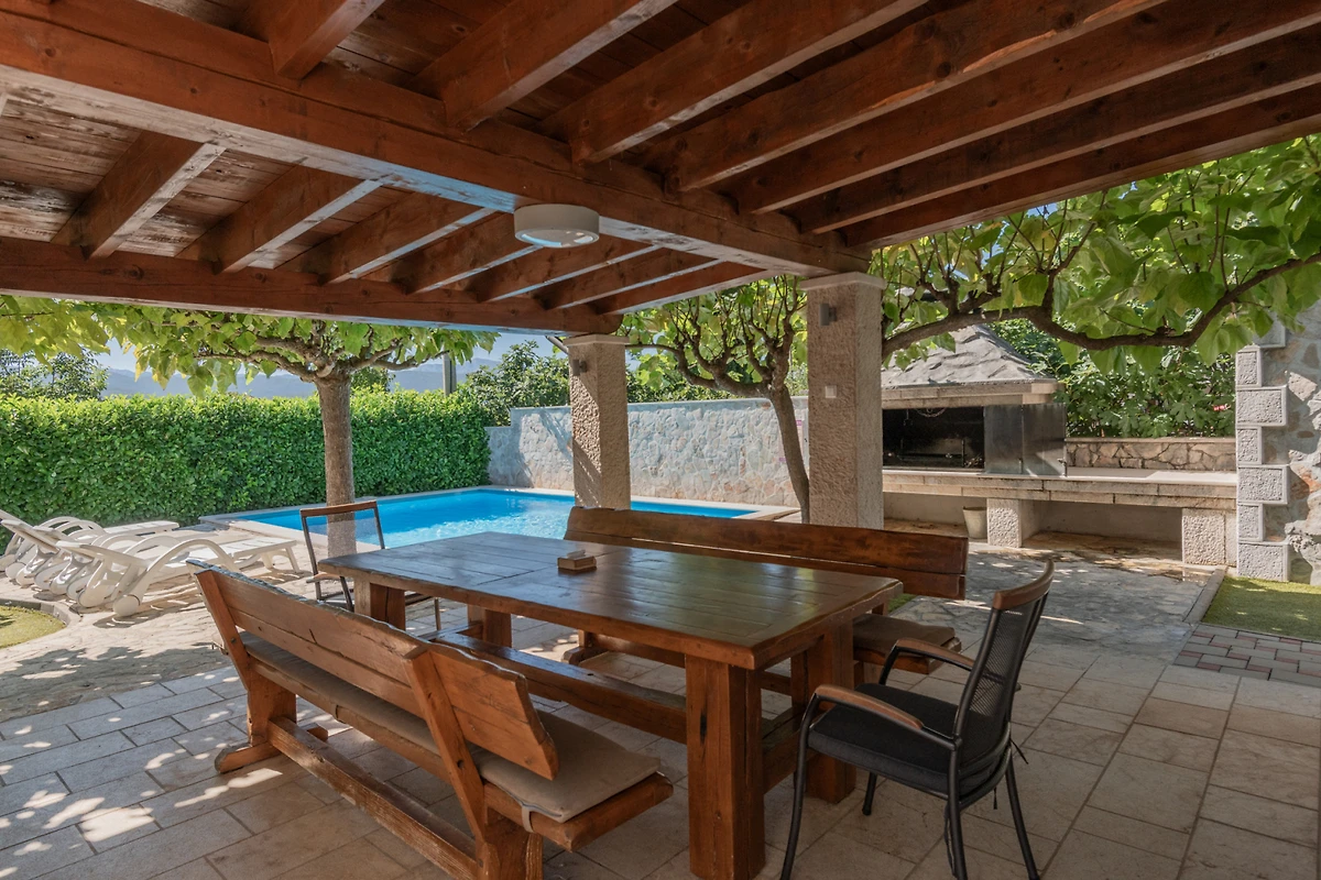 Gli appassionati di attività all'aperto ameranno le caratteristiche estese della villa, tra cui un bellissimo giardino, un lotto recintato, un'area barbecue e una terrazza. La proprietà offre due posti auto privati nel garage, garantendo un parcheggio sicuro e comodo. Situata a Donji Vinjani, la villa offre un ambiente luminoso e confortevole con vista su montagne, piscina e giardino.