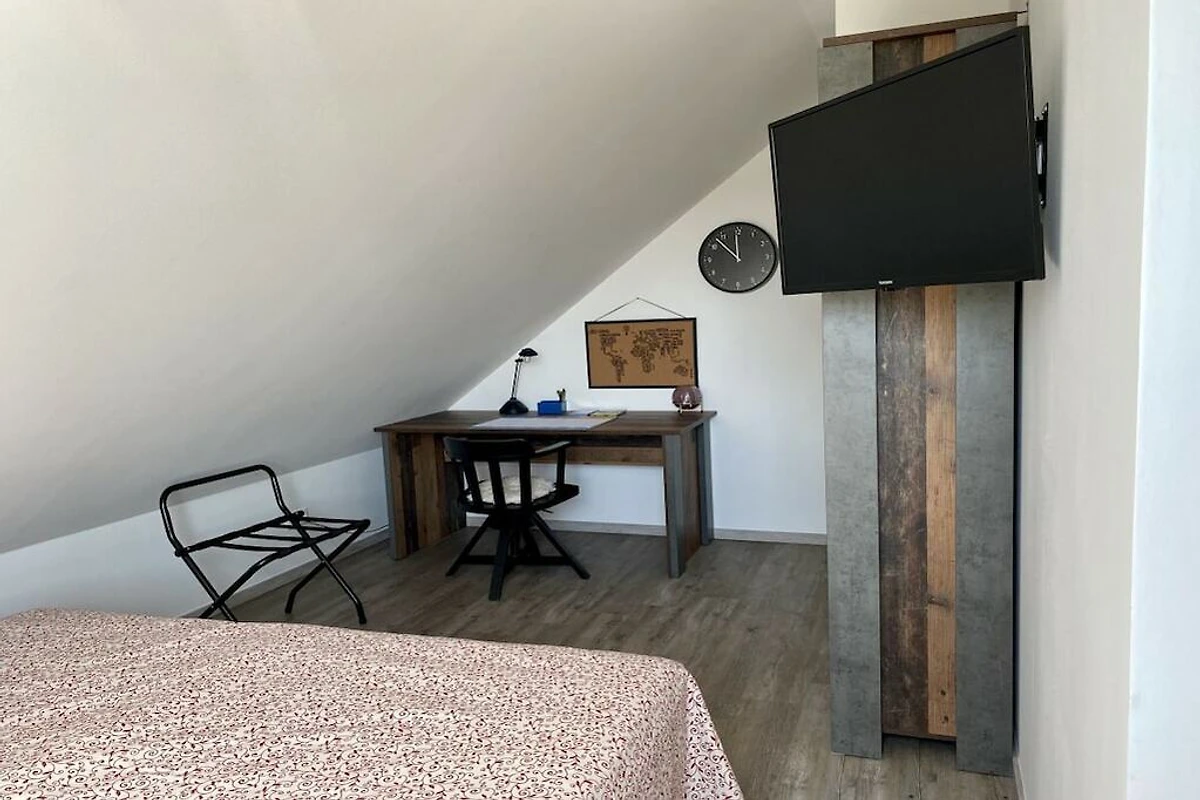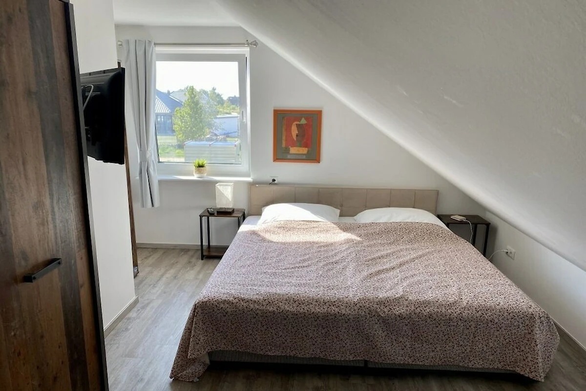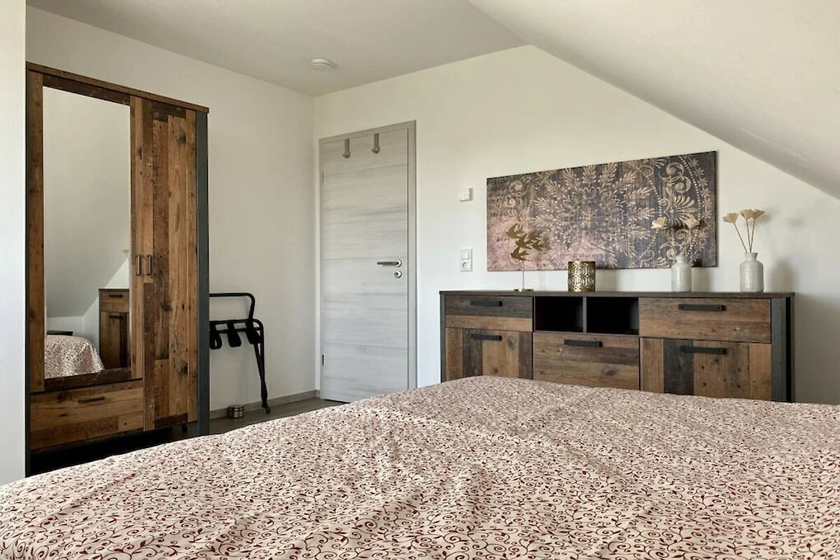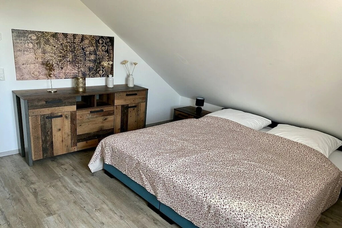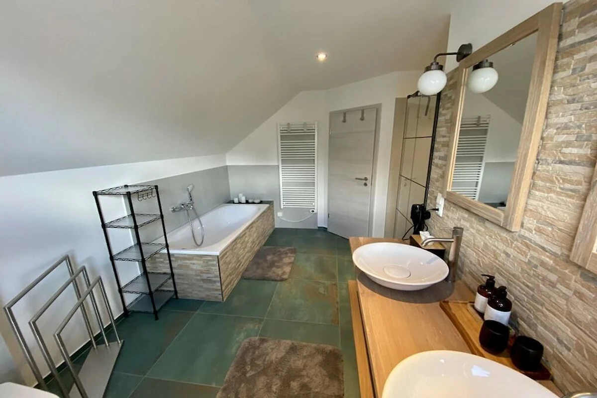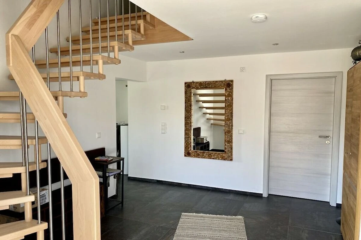 Al piano superiore si trovano tre camere da letto arredate con gusto, ciascuna con letto matrimoniale, e un raffinato bagno con doppio lavabo, cabina doccia e vasca. I letti con box spring misurano 1,80 x 2,00 metri e sono dotati di materassi di alta qualità. Due delle camere da letto dispongono di TV a schermo piatto.