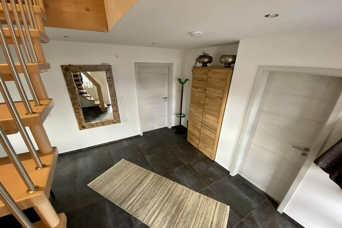L'ampia zona giorno-pranzo open space, che non lascia nulla a desiderare, è collegata all'imponente corridoio. La moderna cucina è completamente attrezzata. Il grande tavolo da pranzo è ideale per organizzare fantastiche serate di gioco. Il comodo divano e la grande TV satellitare invitano al relax. Il piano terra ospita anche un ampio bagno con cabina doccia e sauna. Dopo la sauna, potrete accedere direttamente alla terrazza coperta.