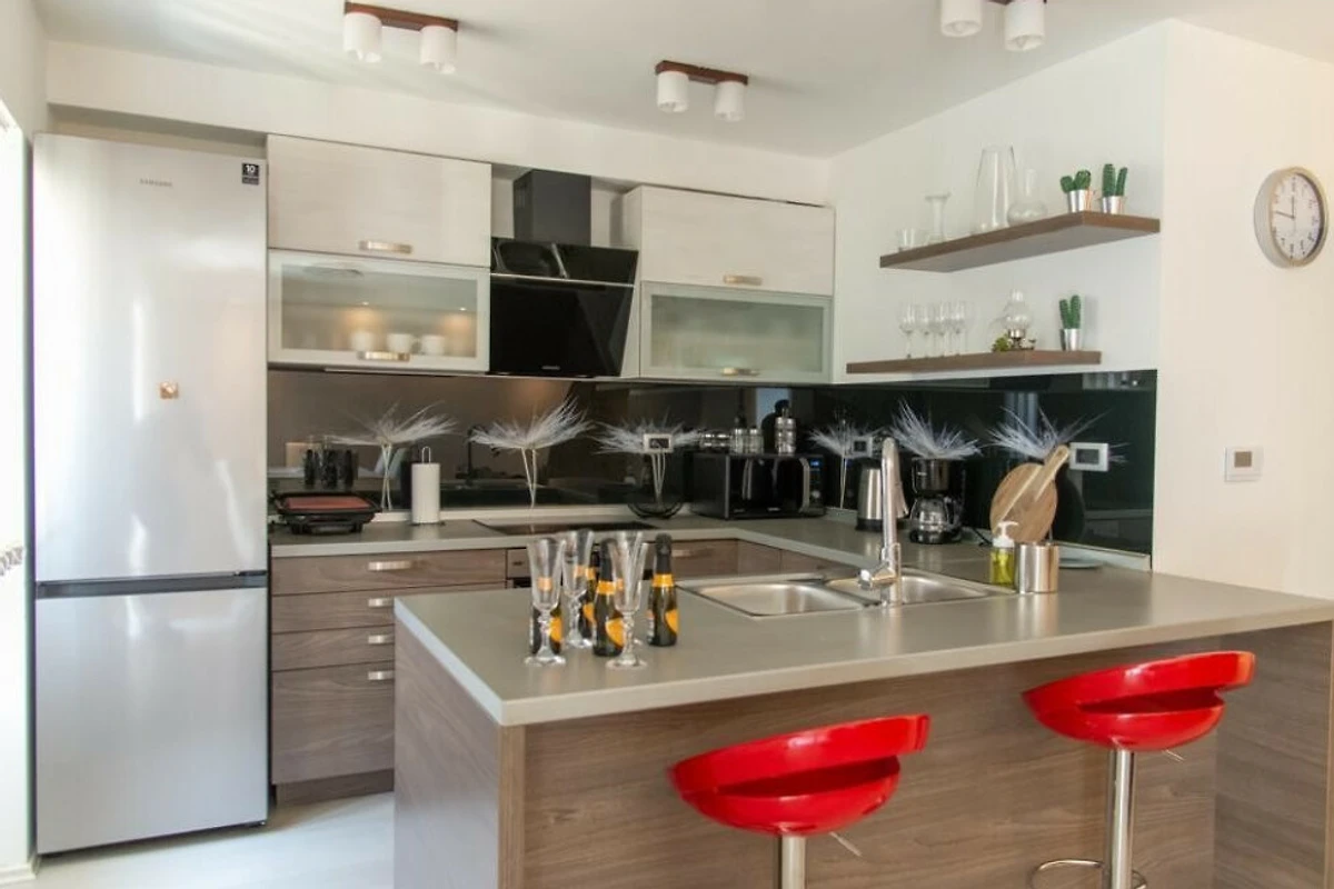 Il cuore della villa è la sua cucina in stile americano moderno, completamente attrezzata con elettrodomestici essenziali tra cui un piano cottura in vetroceramica, frigorifero, congelatore, forno, microonde, lavastoviglie, macchina da caffè e tostapane. Stoviglie e piatti sono forniti, rendendo la preparazione dei pasti un gioco da ragazzi.