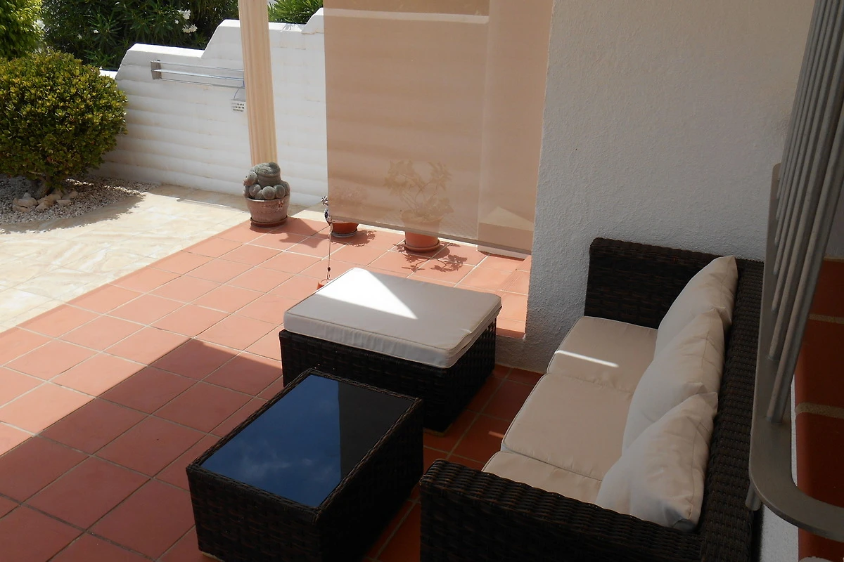 Porta-finestra dal soggiorno al balcone e terrazza per la colazione, dotata di tavoli e sedie. Qui si gode di una vista panoramica sulla valle, Calpe, il Peñon de Ifach, il mare e le montagne circostanti. Scala interna dal piano superiore (living) al corridoio notte al piano terra.