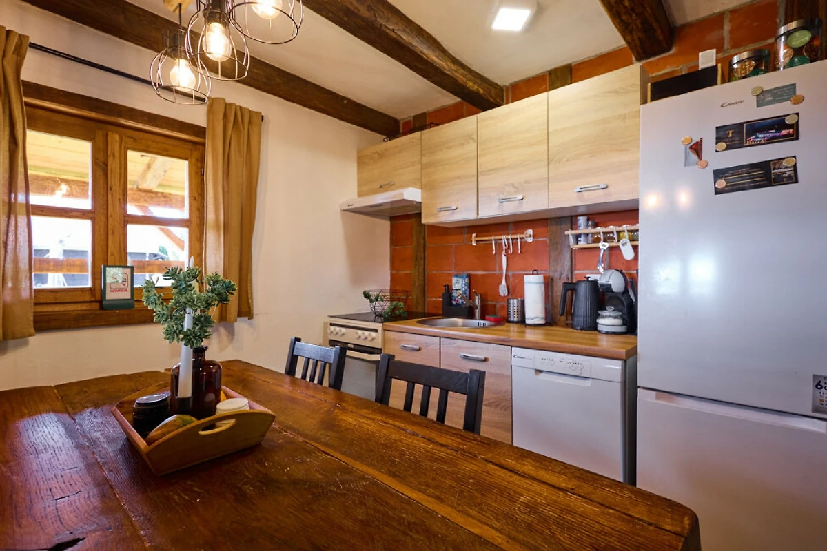 La casa vanta una cucina in stile americano completamente attrezzata con dotazioni moderne tra cui un piano cottura in vetroceramica, frigorifero, congelatore, forno, lavastoviglie, macchina da caffè e stoviglie essenziali. Prepara deliziosi pasti e goditi il tempo in famiglia in questo spazio di cottura ben progettato.