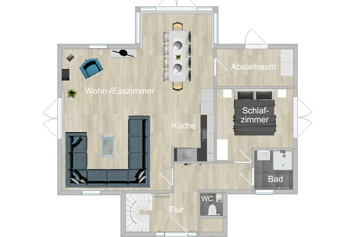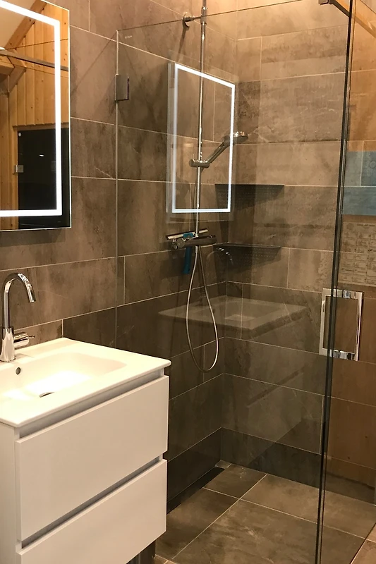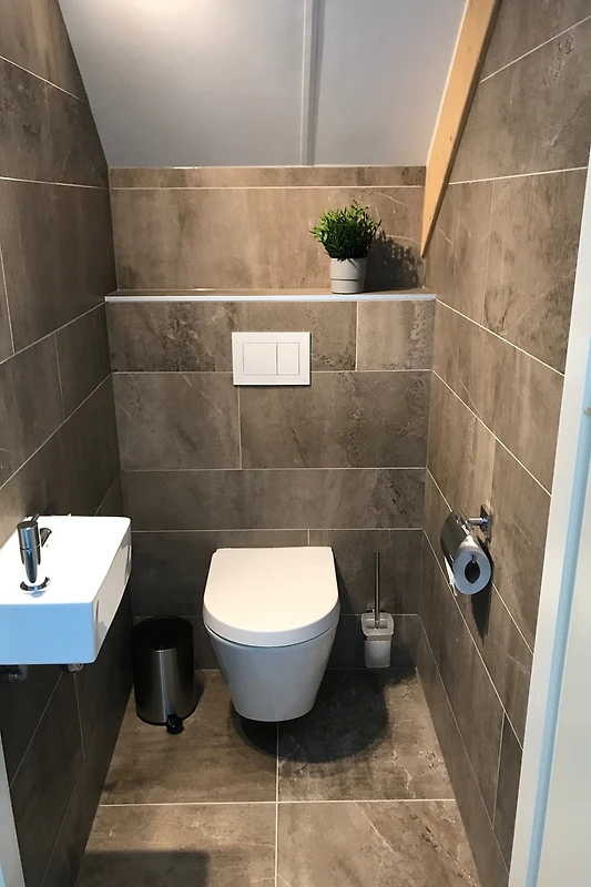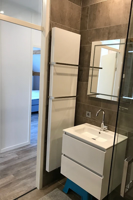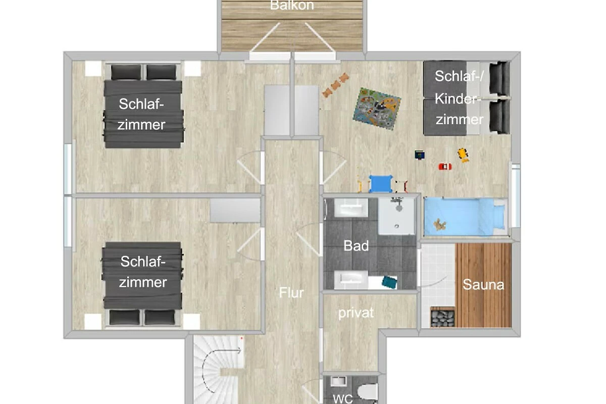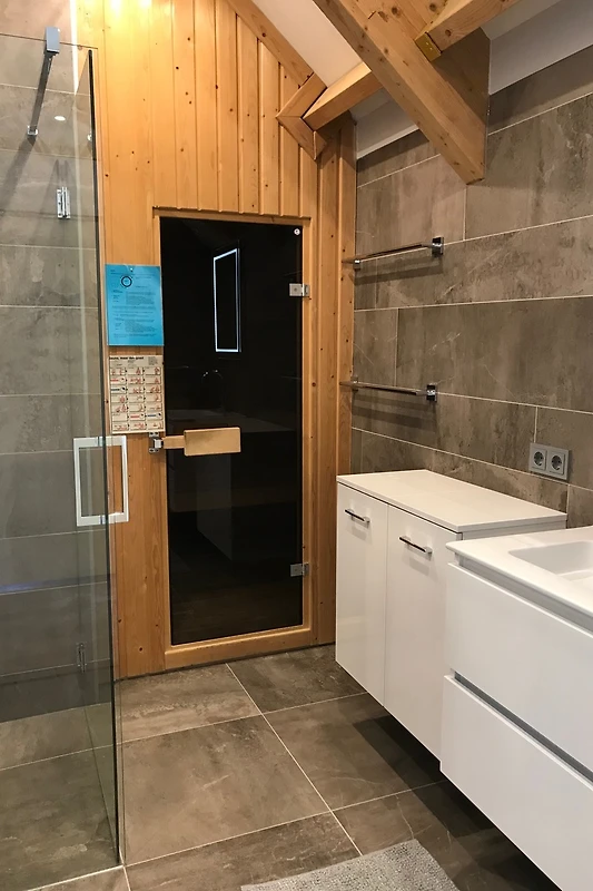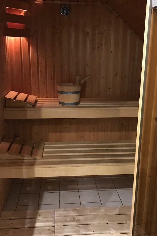 Due camere da letto, ciascuna con un letto boxspring extra lungo (1,80 m x 2,10 m), e la cameretta dei bambini con letto matrimoniale e un letto a castello si trovano al piano superiore. Inoltre, al piano superiore c’è un bagno con doccia a pioggia, 2 lavandini con mobili sottolavabo, scaldasalviette, mobili da bagno, sauna finlandese e un WC separato con lavabo. La quarta camera da letto (anch'essa con letto boxspring extra lungo) si trova al piano terra e dispone di un proprio bagno con doccia a pioggia, lavabo con mobiletto sottostante e scaldasalviette. Anche al piano terra si trova un WC separato con piccolo lavabo.